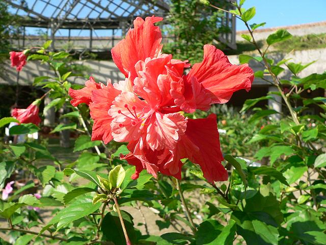レッドフラミンゴ 四季咲きの花 2012年12月24日 ハイビスカスはアオイ科フヨウ属の植物の総称である。多くの園芸品種が生まれているが、主に3系統に分類されている。レッドフラミンゴ(Red Flamingo)もその1つで、コーラル系に属する。風鈴仏桑花(フウリンブッソウゲ:Hibiscus schizopetalus)が交配親となっているグループである。レッドフラミンゴは赤花品種だが、オレンジ色のものもある。別名はエル・カピトリオ(El Capitolio)である。葉は楕円形で互い違いに生える(互生)。手のひら状に裂けるものもあり、葉の縁には粗いぎざぎざ(鋸歯)がある。開花時期は周年である。特徴は2段咲きをすることである。2段目は雄しべが花弁化したものである。花弁には切れ込みが入る。筒状に合着した雄しべは白く、先は赤い。属名の Hibiscus はギリシャ語由来で「Hibis(エジプトの女神)」の名からきているとの説があり、大形のゼニアオイ属につけられた名である。写真は11月に沖縄県本部町の熱帯ドリームセンターで撮った。学名:Hibiscus 'Red Flamingo'★花色は赤く二段に垂れて咲く 花はお洒落なエル・カピトリオ花図鑑植物図鑑|味の麺匠戸田久|おこめの鬼平|フロム蔵王|花の本屋さん|楽天トラベル|