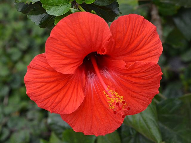 ブリリアント・レッド 四季咲きの花 2014年08月16日 ハイビスカスはアオイ科フヨウ属の植物の総称である。多くの園芸品種が生まれているが、主にオールド系、ハワイアン系、コーラル系の3系統に分類されている。ブリリアント・レッド(Brilliant Red)は、オールド系に属する。仏桑花(ブッソウゲ:Hibiscus rosa-sinensis)やヨーロピアン系と呼ばれるものなどがこの系統に属する。昔から流通している丈夫な品種である。樹高は1メートルから2メートルである。葉は楕円形で、互い違いに生える(互生)。葉の先は尖り、縁には粗いぎざぎざ(鋸歯)がある。開花時期は周年である。花の色は濃い赤色である。花冠はほぼ円形で、深く5つに裂ける。花柱は濃い赤色、柱頭も濃い赤色である。属名の Hibiscus はギリシャ語由来で「Hibis(エジプトの女神)」の名からきているとの説があり、大形のゼニアオイ属につけられた名である。写真は4月に大阪市の咲くやこの花館で撮った。学名:Hibiscus 'Brilliant Red'★鮮やかで濃い赤色が刺激的 南国育ちのプリンセスかな花図鑑植物図鑑|味の麺匠戸田久|おこめの鬼平|フロム蔵王|花の本屋さん|楽天トラベル|