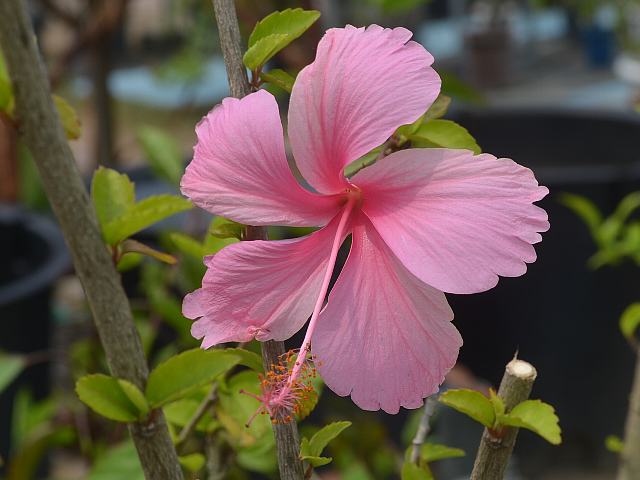 ピンク・バタフライ 四季咲きの花 2014年08月10日 ハイビスカスはアオイ科フヨウ属の植物の総称である。多くの園芸品種が生まれているが、主に3系統に分類されている。ピンク・バタフライ(Pink Butterfly)もその1つで、コーラル系に属する。風鈴仏桑花(フウリンブッソウゲ:Hibiscus schizopetalus)が交配親となっているグループである。花の様子は赤花の仏桑花(ブッソウゲ:Hibiscus rosa-sinensis)とよく似ている。別名はコーラルピンク(Coral Pink)という。別名のものを既に沖縄で撮っていたが札幌で撮ったので改めて掲載する。樹高は1メートルから2メートルである。葉は楕円形で互い違いに生える(互生)。手のひら状に裂けるものもあり、葉の縁には粗いぎざぎざ(鋸歯)がある。開花時期は周年である。花径は10センチくらいで、花の色はピンクである。花弁には切れ込みが入る。筒状に合着した雄しべはピンクで、柱頭もピンクである。属名の Hibiscus はギリシャ語由来で「Hibis(エジプトの女神)」の名からきているとの説があり、大形のゼニアオイ属につけられた名である。写真は7月に北大植物園で撮った。学名:Hibiscus 'Pink Butterfly'★北国の夏に出合ったハイビスカス 調べてみれば別名なのか花図鑑植物図鑑|味の麺匠戸田久|おこめの鬼平|フロム蔵王|花の本屋さん|楽天トラベル|