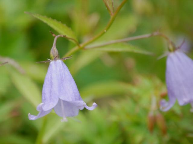 大花の姫沙参(オオバナノヒメシャジン) 夏の花 2011年08月31日 姫沙参(ヒメシャジン)はキキョウ科ツリガネニンジン属の多年草である。日本固有種である。本州の東北地方南部から中部地方にかけて分布し、高山の砂礫地や岩場に生える。このうち群馬県の本白根山の特産で、花冠の長さが3センチくらいある大輪のものがある。これを大花の姫沙参(オオバナノヒメシャジン)として区別する考え方がある。草丈は10~40センチくらいである。茎は細くて、多くは毛がない。葉は披針形(笹の葉のような形)で、多くは互い違いに生える(互生)。開花時期は7~9月である。釣鐘状の青紫色の花を下向きに1~10輪くらいつける。花柱(雌しべ)は花冠と同じくらいの長さかやや長い。萼片は細い線形で疎らにぎざぎざ(鋸歯)がある。花の後にできる実はさく果(熟すると下部が裂け、種子が散布される果実)である。変種の深山沙参(ミヤマシャジン)はよく似ているが、花柱(雌しべ)が突き出し萼片にぎざぎざがないことで見分ける。「沙参」は釣鐘人参(ツリガネニンジン)のことで、「姫」は小さいことを指す。属名の Adenophora はギリシャ語の「adenos(腺)+phoreo(有する)」からきている。植物体全体に乳液を出す腺細胞があることから名づけられた。種小名の nikoensis は「日光の」という意味である。品種名の macrocalyx は「大きな萼の」という意味である。写真は8月に志賀高原の東館山高山植物園で撮った。学名:Adenophora nikoensis f. macrocalyx★名づけ方どこか変だと思うけど 想像できる変異の多さ花図鑑植物図鑑PR