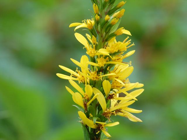 雌宝香(メタカラコウ) 夏の花 2011年08月12日 雌宝香(メタカラコウ)はキク科メタカラコウ属の多年草である。本州から九州にかけて分布し、亜高山帯の湿気の多い草原などに生える。海外では、台湾、中国にも分布する。草丈は60~100センチくらいである。根際から生える葉は長い柄のある三角状の心形で、先は尾状に突き出す。また、つけ根側の両端も尖る。雄宝香(オタカラコウ)の葉は、ほぼ心形である。開花時期は6~9月である。茎先に総状花序(柄のある花が花茎に均等につく)を出し、たくさんの黄色い頭花をつける。真ん中にある筒状花6~11枚である。周りにつく舌状花は1~3枚と極端に少ない。雄宝香(オタカラコウ)の舌状花は5~9枚ある。花の後にできる実はそう果(熟しても裂開せず、種子は1つで全体が種子のように見えるもの)である。「宝香」というのは防虫剤として使われる竜脳香のことである。根茎の香りが似ているということでつけられた名である。「雌」は雄宝香(オタカラコウ)に比べて優しい感じがするところからきている。属名の Ligularia はラテン語の「ligula(舌)」からきている。小さい舌状の花弁から名づけられた。種小名の stenocephala は「細い頭の」という意味である。写真は8月に伊吹山で撮った。学名:Ligularia stenocephala★花びらが落ちてしまった訳じゃない もともとこうさと雌宝香は花図鑑植物図鑑PR