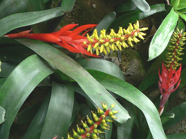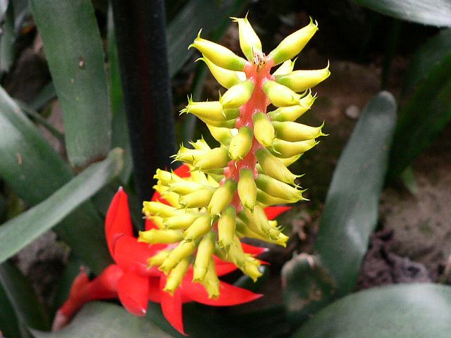エクメア・ヌデイカウリス 夏の花 2014年06月05日 エクメア・ヌデイカウリスはパイナップル科サンゴアナナス属(エクメア属)の常緑多年草である。エクメア属は南アメリカの熱帯地方に150種くらい分布する。同属のエクメア・フルゲンス(Aechmea fulgens)の和名を珊瑚アナナス(サンゴアナナス)といい、そこから属名の和名をサンゴアナナス属という。本種の原産地はメキシコからブラジルである。草丈は60センチから90センチくらいである。葉は幅の広い線形で灰緑色をしており、短い棘が密生する。開花時期は春から夏である。紅色の花穂を出し、黄色の花をつける。花はすぐに散るが、萼は長く鑑賞できる。属名の Aechmea はギリシャ語の「aichme(槍)」からきている。種小名の nudicaulis は「裸の茎を持った」という意味である。写真は6月に川口市立グリーンセンターで撮った。学名:Aechmea nudicaulis★赤と黄のコントラストが目くるめく ヌデイカウリスは灼熱の花花図鑑植物図鑑|味の麺匠戸田久|おこめの鬼平|フロム蔵王|花の本屋さん|楽天トラベル|