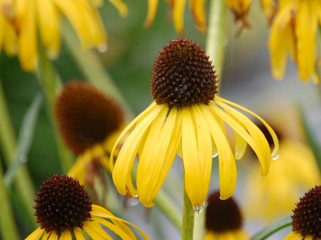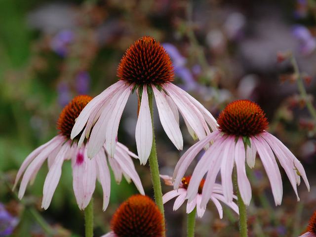 エキナセア 秋の花 2016年10月14日 エキナセアはキク科ムラサキバレンギク属(エキナケア属)の多年草の総称である。エキナケア属は暫定的な学名だが北アメリンに10種が分布する。(Catalogue of Life: 2016 Annual Checklist より)また、多くの園芸品種が作出されている。代表種であるエキナケア・プルプレアに紫馬簾菊(ムラサキバレンギク)の和名があり、和名の属名もムラサキバレンギク属という。「馬簾」というのは、江戸時代の火消しが用いた纏(まとい)の飾りのことである。園芸的には属名を英語風に読んだエキナセアの名で流通している。日本へは昭和時代の初期に渡来した。庭植え、鉢植えで観賞用に栽培されるほか、切り花やドライフラワーともされる。また、根茎には免疫力を高める作用があり、ハーブとしても利用される。草丈は60センチから150センチくらいである。茎は直立をする。葉は卵形で、互い違いに生える(互生)。葉の先は尖り、縁にはぎざぎざ(鋸歯)がある。開花時期は6月から10月くらいである。代表種は茎先に紅紫色の花をつけるが、黄色や白の花を咲かせるものもある。花言葉は「深い愛」である。10月13日の誕生花である。属名の Echinacea はギリシャ語の「echino(はりねずみ)」からきている。硬い筒状花をはりねずみにたとえて名づけたものである。写真は5月に東京都薬用植物園で撮った。写真はエキナケア・プルプレアとエキナケア・パラドクサである。学名:Echinacea spp.★ネイティブの息吹き伝えてエキナセア 棘が守りし薬効いかに花図鑑植物図鑑ミラーサイト|味の麺匠戸田久|おこめの鬼平|フロム蔵王|花の本屋さん|楽天トラベル|