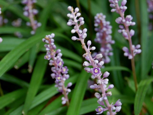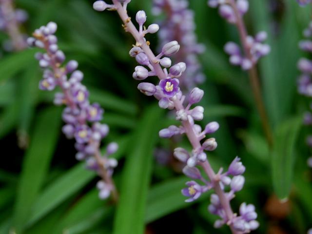 薮蘭(ヤブラン) 秋の花 2016年10月20日 薮蘭(ヤブラン)はユリ科ヤブラン属(リリオペ属)の多年草である。分類体系によっては(APG第3版)クサスギカズラ科とされる。リリオペ属は東アジアや東南アジアに8種が分布する。日本にも本種などが分布し、属名の和名をヤブラン属という。本種は本州の関東地方から沖縄にかけて分布し、林の中に生える。海外では、朝鮮半島、台湾、中国に分布する。和名の由来は、葉の形が春蘭(シュンラン)に似ていて薮に生えることからきている。その名は既に平安時代の文献(深根輔仁編纂「本草和名」901-923年, など)に著されている。また、「やますげ」の名で万葉集にも詠まれているものは本種ではないかとの説がある。ただし、牧野富太郎さんはこの説を否定している。草丈は30センチから50センチくらいである。葉は根際から生え、線形で艶がある。開花時期は8月から10月である。茎先に総状花序(柄のある花が花茎に均等につく)を出し、淡い紫色の小さな花をたくさんつける。花被片は6枚で、丸い釣鐘形をしている。花の後には液果状の種子ができ、黒紫色に熟する。花言葉は「隠された心」である。10月6日の誕生花である。属名の Liriope はギリシャ神話に登場するナルキッソスの母でニンフの「レイリオペ(Leiriope)」の名からきている。種小名の muscari は「麝香の」という意味である。写真は9月に市川市万葉植物園で撮った。学名:Liriope muscari ★雑草と見紛うような葉っぱから 花茎伸ばし薮蘭の咲く☆艶やかな葉で楽しませ藪蘭は 奥ゆかしげな小花を咲かせ花図鑑植物図鑑ミラーサイト|味の麺匠戸田久|おこめの鬼平|フロム蔵王|花の本屋さん|楽天トラベル|PR