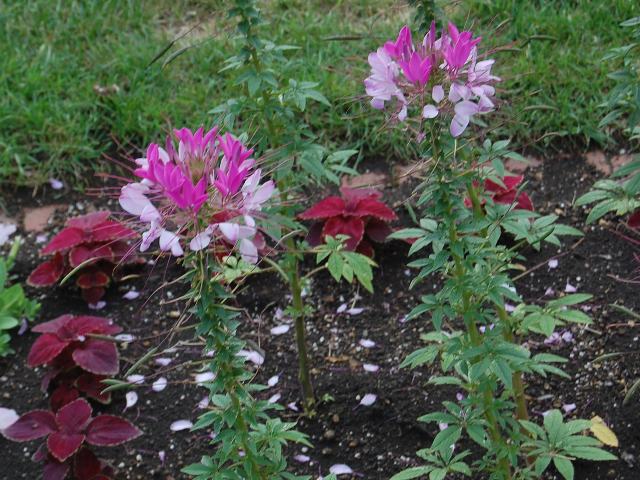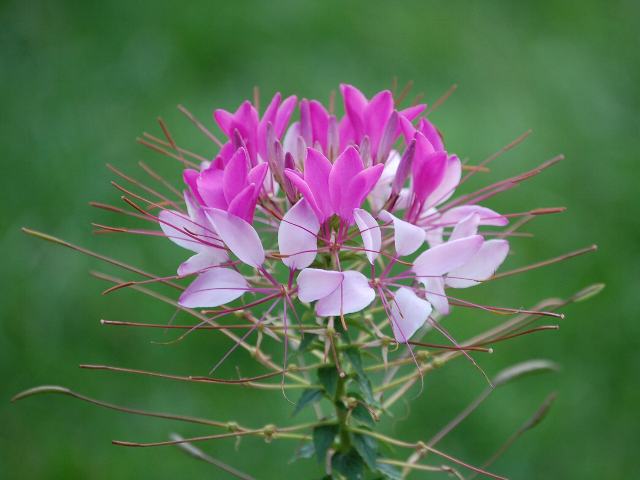 クレオメ 夏の花 2016年08月21日 クレオメ(cleome)はフウチョウソウ科タレナヤ属の一年草である。分類体系によっては(APG第3版)アブラナ科とされる。タレナヤ属は5種が分布する。(Catalogue of Life: 2016 Annual Checklist より)かつて属していたクレオメ属(フウチョウソウ属)から分離された属である。本種の原産地は熱帯アメリカである。英名はスパイダーフラワー(spider flower)という。日本へは明治時代の初期に渡来した。 和名は西洋風蝶草(セイヨウフウチョウソウ)という。和名の由来は、風に舞う蝶のような花姿で洋種であることからきている。別名をクレオメやクレオメ草(クレオメソウ)という。これは旧属名からきた名である。庭植え、鉢植えで観賞用に栽培されている。逸出したものが全国各地で野生化している。例えば北海道のブルーリストではBランク(北海道に定着している外来種)に選定されている。草丈は80センチから120センチくらいである。葉は手のひら状の複葉で、互い違いに生える(互生)。小葉は5枚から7枚からなる倒卵形で、縁にはわずかにぎざぎざ(鋸歯)がある。開花時期は7月から9月である。茎先に総状花序(柄のある花が花茎に均等につく)を出し、たくさんの4弁花をつける。花の色は桃色が多いが、白や紫色のものもある。4本ある雄しべが長くて目立つ。花は下から上へと咲き上っていく。夕方から咲き始め、翌日の昼ころには花の色が薄くなる。花の後にできる実は長いさく果(熟すると下部が裂け、種子が散布される果実)である。花言葉は「秘密のひととき」である。8月18日の誕生花である。属名の Tarenaya の語源はまだ調べられていない。種小名の spinosa は「棘の多い」という意味である。写真は7月に札幌の大通公園で撮った。学名:Tarenaya spinosa(異名:Cleome spinosa)★クレオメは頬に紅差す夜の蝶 今宵咲くのは主のためなり☆薄紅に頬を染めれば愛らしく 秘密のときに花は酔いしれ花図鑑植物図鑑ミラーサイト|味の麺匠戸田久|おこめの鬼平|フロム蔵王|花の本屋さん|楽天トラベル|