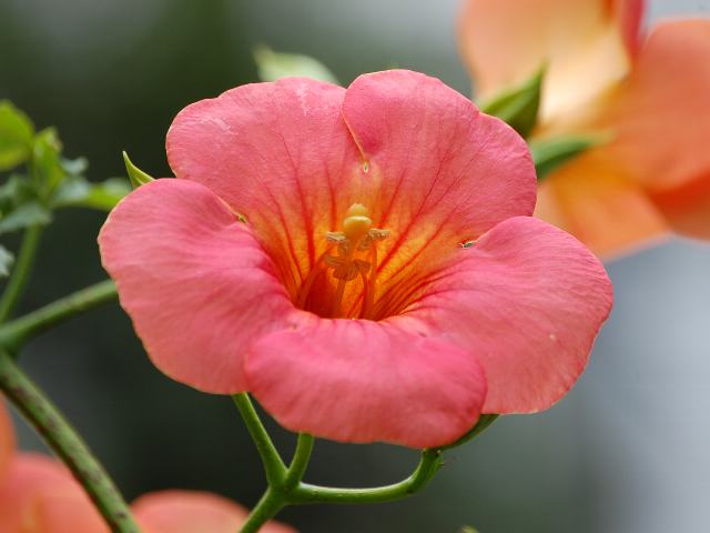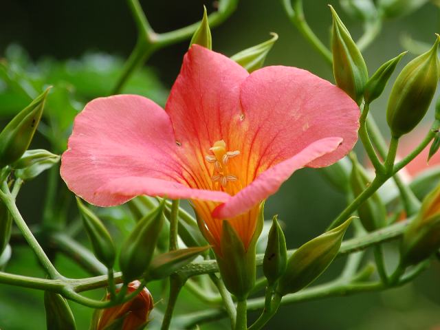 凌霄花(ノウゼンカズラ) 夏の花 2016年08月22日 濡れそぼり佇むごとく凌霄花凌霄花(ノウゼンカズラ)はノウゼンカズラ科ノウゼンカズラ属(カンプシス属)の蔓性落葉低木である。カンプシス属は本種とアメリカ凌霄花(アメリカノウゼンカズラ)の2種が分布する。本種が代表種で、属名の和名はノウゼンカズラ属という。本種の原産地は中国である。中国では、古くから薬用として使われていた。中国名は凌霄花(lingxiaohua)という。凌には「しのぐ」、霄には「そら」の意味がある。「天を凌ぐほど高く登る花」という意味になる。日本へは平安時代かそれより古い時代に渡来した。918年に刊行された最古の薬学書「本草和名」(深根輔仁撰)に記載がある。和名は、中国名に日本での古名である乃宇世宇(のうせう)を充てたものである。樹高は2メートルから5メートルくらいである。幹から気根を出して樹木やフェンスなどを這い登る。葉は奇数羽状複葉(鳥の羽のように左右に小葉がいくつか並び、先に1つの小葉がついて1枚の葉が構成される)で、向かい合って生える(対生)。3対から6対の小葉からなり、先に1枚の小葉がつく。小葉の形は細長い卵形で、先は細長く尖り、縁には粗いぎざぎざ(鋸歯)がある。開花時期は6月から9月である。オレンジ色の大きい漏斗状の花をたくさんつける。 花径は5センチから10センチくらいで、花冠の先は5つに裂ける。雨や曇の日が続くと、花や蕾が落ちやすくなる。花の後にできる実はさく果(熟すると下部が裂け、種子が散布される果実)である。俳句の季語は夏である。花言葉は「名誉」である。8月19日の誕生花である。近年はアメリカ凌霄花(アメリカノウゼンカズラ)と交配した園芸品種が販売されており、赤のより濃いものや桃色、黄色などのものもある。属名の Campsis はギリシャ語の「campsis(湾曲)」からきている。雄しべが弓形をしていることから名づけられた。種小名の grandiflora は「大きな花の」という意味である。写真は6月に向島百花園で撮った。学名:Campsis grandiflora★艶やかに凌霄花濡れそぼり 絡むともなく立ちすくみおり花図鑑植物図鑑ミラーサイト|味の麺匠戸田久|おこめの鬼平|フロム蔵王|花の本屋さん|楽天トラベル|