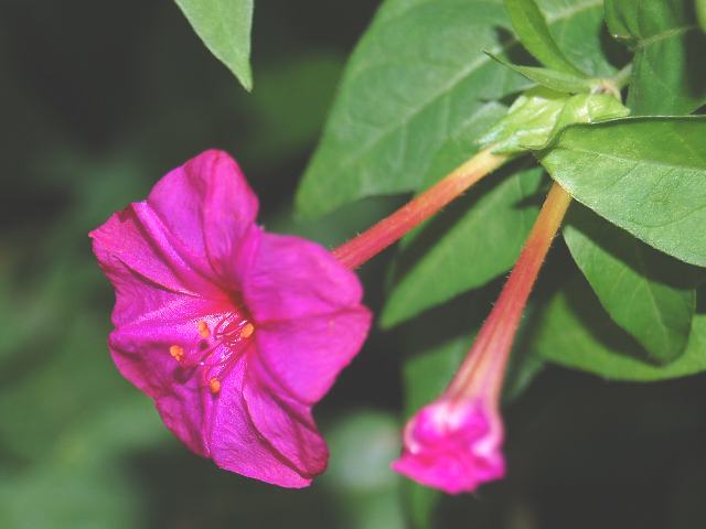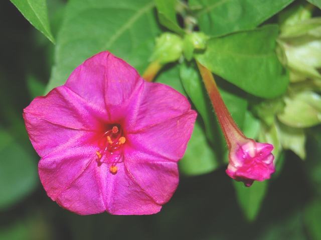 白粉花(オシロイバナ) 秋の花 2016年08月24日 飯事の母を演ずや白粉花で白粉花(オシロイバナ)はオシロイバナ科オシロイバナ属(ミラビリス属)の多年草である。ミラビリス属は南北アメリカ大陸に58種が分布する。(Catalogue of Life: 2016 Annual Checklist より)代表種の本種に白粉花(オシロイバナ)の和名があり、属名の和名もオシロイバナ属という。本種の原産地は中南アメリカである。英名はフォーオクロック(four-o'clock)という。中国名は紫茉莉(zimoli)という。日本へは江戸時代の初期に渡来した。和名の由来は、熟した黒い種をつぶすと白粉のような白い粉が出てくるところからきている。貝原益軒が命名したとのことである。庭植え、鉢植えで観賞用に栽培されている。現在では、逸出したものが本州から沖縄にかけて野生化している。北海道のブルーリストではDランク(北海道に導入されており定着することが懸念されるが状況は不明な外来種)に選定されている。草丈は60センチから120センチくらいである。葉は卵形で、互い違いに生える(互生)。葉の縁にぎざぎざ(鋸歯)はない。開花時期は6月から11月くらいである。茎先に集散花序(最初の花が枝先につき、その下に次々と側枝を出して花がつく)を出し、花径2センチくらいの漏斗状の花をつける。花冠は筒部が長く先で5つに裂ける。花の色は赤、白、ピンク、黄色などで、絞りのものもある。萼片は5枚、雄しべ1本、雌しべ1本である。花の後にできる実はそう果(熟しても裂開せず、種子は1つで全体が種子のように見えるもの)である。俳句の季語は秋である。花言葉は「臆病」である。8月23日の誕生花である。属名の Mirabilis はラテン語の「mirari(驚く)」からきている。Mirabilisには「不思議な、素敵な」の意味がある。種小名の jalapa は「(メキシコの)ヤラッパの」という意味である。写真は10月に向島百花園で撮った。実の写真は9月に木場公園の外来植物園で撮った。学名:Mirabilis jalapa★お白粉を塗って薄紅頬にさす 謎の習わし不思議の世界☆夕闇を待ちて花咲く鮮やかに 色と香りは恋を誘い 花図鑑植物図鑑ミラーサイト|味の麺匠戸田久|おこめの鬼平|フロム蔵王|花の本屋さん|楽天トラベル|