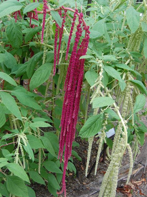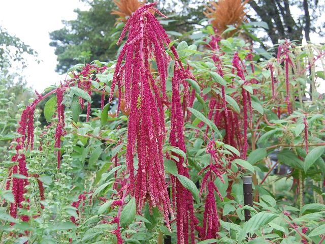 紐鶏頭(ヒモゲイトウ) 秋の花 2016年09月06日 紐鶏頭(ヒモゲイトウ)はヒユ科ヒユ属(アマランツス属)の一年草である。アマランツス属は世界に88種が分布する。(Catalogue of Life: 2016 Annual Checklist より)同属の中に葉を食用とするひゆ(ヒユ)が含まれ、属名の和名をヒユ属という。本種の原産地は南アメリカで、アンデス地方の山岳地帯に分布する。葉鶏頭(ハゲイトウ)に近い仲間だが、本種は花穂を楽しむ。ペンダント・アマランス(pendant amaranth)などの英名がある。日本へは江戸時代の後期に渡来した。庭植え、鉢植えとして観賞用に栽培される。また、切り花やドライフラワーとしても利用される。和名の由来は、花穂が紐状になった鶏頭(ケイトウ)ということからきている。鶏頭(ケイトウ)の名は花序を鶏冠(とさか)に見立てたものである。別名を仙人穀(センニンコク)という。これは仙人の食べる穀物という意味合いでつけられた名である。草丈は70センチから100センチくらいである。葉は楕円形で、互い違いに生える(互生)。開花時期8月から10月である。紅色の花穂がひも状に長く垂れ下がる。花の後にできる実は胞果(薄皮のような果皮の中に種子が1個入っているもの)である。アマランサスの名で自然食品としても出回っている。花言葉は「心配ご無用」である。9月2日の誕生花である。属名の Amaranthus はギリシャ語の「amaramthos(しぼまない)」からきている。種小名の caudatus は「尾のある」という意味である。写真は9月に京都府立植物園で撮った。園芸品種のレッドとグリーンである。学名:Amaranthus caudatus★ぶらぶらと花穂垂らして紐鶏頭 ユニークすぎる花と呼ぶには花図鑑植物図鑑ミラーサイト|味の麺匠戸田久|おこめの鬼平|フロム蔵王|花の本屋さん|楽天トラベル|PR