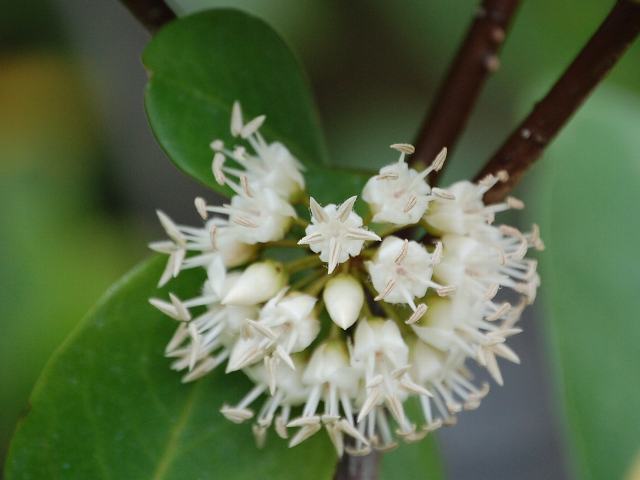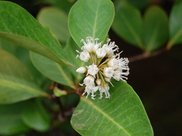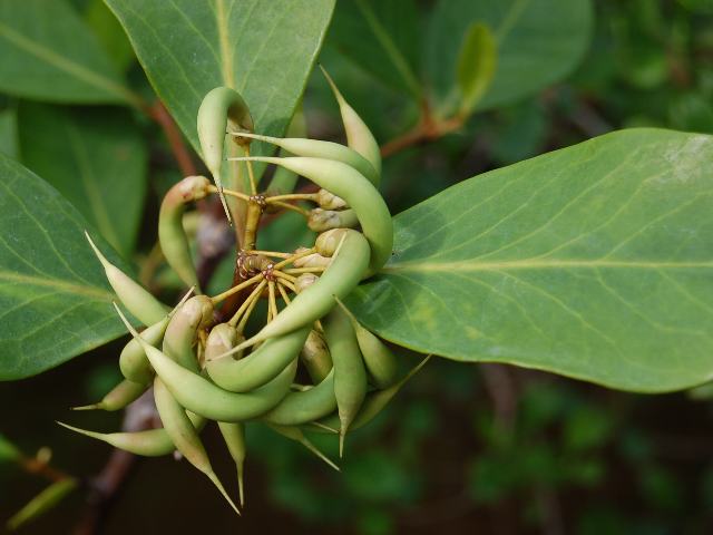 角薮柑子(ツノヤブコウジ) 未選択 2013年08月13日 角薮柑子(ツノヤブコウジ)はヤブコウジ科ツノヤブコウジ属の常緑低木である。分類体系によってはサクラソウ科とされる。原産地は、中国南部、東南アジア、インド、ニューギニア、オーストラリアなどである。マングローブ林の縁や水路に面して生える。日本には分布していない。樹高は2~3メートルである。葉は倒卵形で、輪生状に互い違いに生える(互生)。開花時期は不定期で、白い花を総状につける。実(偽胎生種子)は彎曲した角状で、中に胎生種子ができる。「胎性種子」というのは、枝についた実から太い根が伸び、根の先に新芽ができた状態で実から抜け落ちるもののことで、海流に乗って散布される。「偽胎生種子」というのは、実の中に胎生種子ができているもののことである。実は熟すと赤くなる。属名の Aegiceras はギリシャ語の「aigis(ヤギ)+keras(角)」からきている。種小名の corniculatum は「つののある」という意味である。花の写真は8月につくば植物園で撮った。実の写真は11月につくば植物園で撮った。学名:Aegiceras corniculatum★熱帯のマングローブの森にある 神秘の樹木角薮柑子 花図鑑植物図鑑|味の麺匠戸田久|おこめの鬼平|フロム蔵王|花の本屋さん|楽天トラベル|