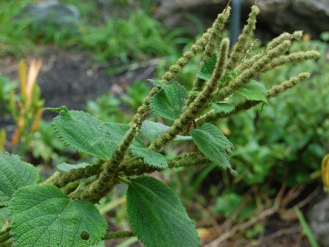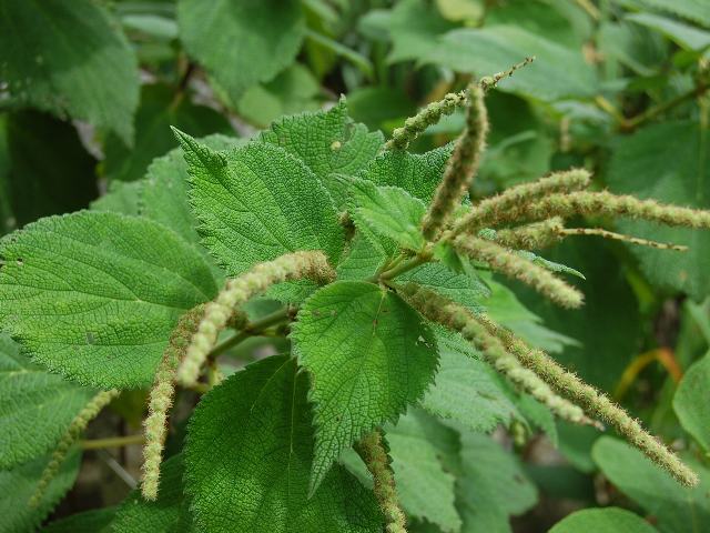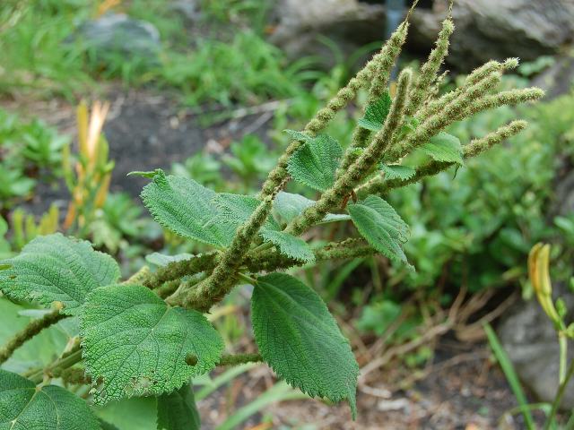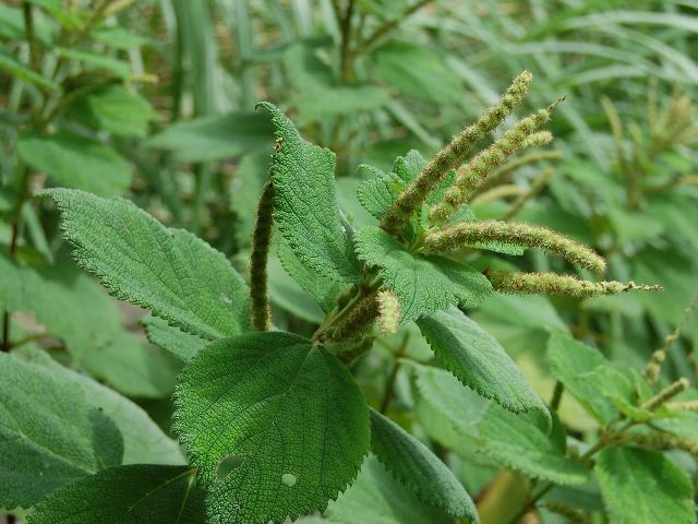 浜藪苧麻(ハマヤブマオ) 夏の花 2013年08月15日 浜藪苧麻(ハマヤブマオ)はイラクサ科カラムシ属の多年草である。本州から沖縄にかけて分布し、海岸近くの原野や川の土手などに生える。海外では、中国やインドシナ半島にも分布する。別名を鬼藪苧麻(オニヤブマオ)という。草丈は70~150センチくらいになる。茎の下部は木質化する。葉は卵形で長さが10~15と大きく、向かい合って生える(対生)。藪苧麻(ヤブマオ)と比べると、葉が大きい、重鋸歯(ぎざぎざが二重)とならない、葉の裏面にビロード状に毛が密生するなどの特徴がある。開花時期は8~10月である。雌雄同株である。雄花序は下部の葉のつけ根につき、雌花序は上部の葉のつけ根につく。雄花穂は球状、雌花穂は穂状になる花の後にできる実はそう果(熟しても裂開せず、種子は1つで全体が種子のように見えるもの)である。「苧麻」というのは茎蒸(カラムシ)の古名である。古代人にとって茎蒸(カラムシ)は大切な植物であった。茎を蒸して繊維をとったのである。「藪」は役に立たないという意味をもつ。役に立たない「苧麻」ということである。属名の Boehmeria はドイツの植物学者「ボーマー(Georg Rudolf Boehmer, 1723-1803)さん」の名からきている。種小名の arenicola は「砂地に棲む」という意味である。写真は8月につくば植物園で撮った。学名:Boehmeria arenicola★勇ましい名前もらって反り返る 鬼藪苧麻に参った参った花図鑑植物図鑑|味の麺匠戸田久|おこめの鬼平|フロム蔵王|花の本屋さん|楽天トラベル|