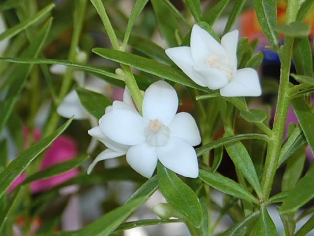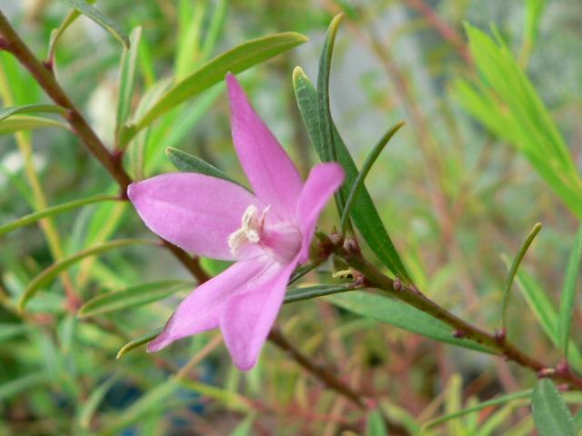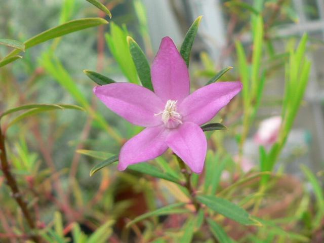 サザンクロス 夏の花 2013年08月09日 サザンクロス(southern cross)はミカン科クロウエア属の常緑小低木である。原産地はオーストラリア南東部のニューサウスウェールズ州で、森林地帯に生える。表記の名は日本での流通名である。南十字星を意味し、花が星形でオーストラリア産というところから名づけられた。属名のクロウエアでも流通している。英名はウィロウリーフクロウエア(willow leaf crowea)である。樹高は70~100センチくらいである。葉は披針形(笹の葉のような形)で、互い違いに生える(互生)。葉の質は厚く艶がある。葉の縁にぎざぎざ(鋸歯)はない。揉むと柑橘系の香りがする。開花時期は5~11月である。葉の脇からピンク色をした星形の小さな5弁花を咲かせる。蝋質で、花の色は稀に白いものもある。なお、近縁種のクロウエア・エクサラタ(Crowea exalata)やこの2種の交配種もサザンクロスの名で流通している。属名の Crowea は、イギリス人の医師で植物学者の「クロウ(James Crowe, 1750-1807)さん」の名からきている。種小名の saligna は「ヤナギのような」という意味である。写真は5月に北大植物園で撮った。3枚目は11月にJAあゆみ野安行園芸センターで撮った白花種である。学名:Crowea saligna★スマートな星形の花ピンク色 サザンクロスの輝き放ち