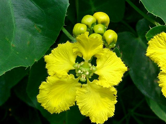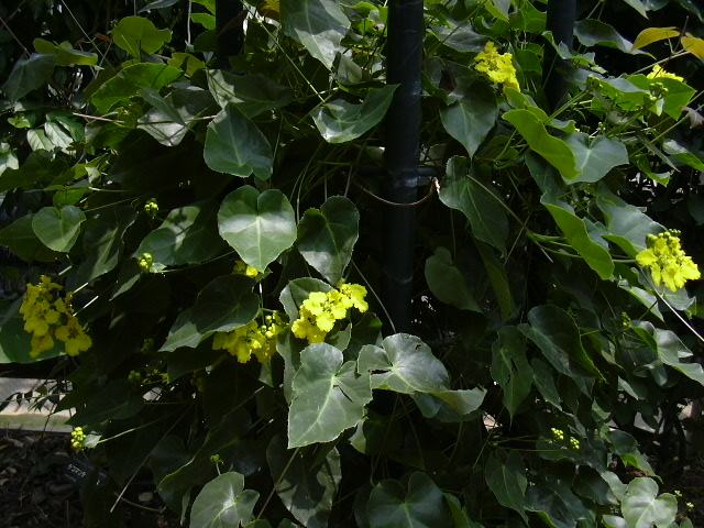 蔓金虎の尾(ツルキントラノオ) 未選択 2013年08月10日 蔓金虎の尾(ツルキントラノオ)はキントラノオ科スティグマフィロン属の蔓性常緑低木である。原産地は南アメリカである。他の樹木などに絡みついて伸び、蔓の長さは5メートルくらいになる。葉は幅の広い卵形で先が尖り、互い違いに生える(互生)。葉の表面は艶があり、葉の縁には棘のようなぎざぎざ(鋸歯)がある。開花時期は6~10月くらいである。葉の脇から散形花序(枝先に1個つずつ花がつく)を出し、小さな黄色い5弁花をつける。花弁の縁が襞状になる。花弁がラン科のオンシジウムに似ていることからオーキッドバイン(orchid vine)の英名がある。また、産地と形状からブラジリアンゴールデンバイン(Brazilian golden vine)とも呼ばれる。属名の Stigmaphyllon はギリシャ語の「stigma(柱頭)+ phyllon(葉)」からきている。葉のような柱頭を持つことから名づけられた。種小名の ciliatum は「縁毛のある」という意味である。写真は6月に神奈川県立フラワーセンター大船植物園で撮った。学名:Stigmaphyllon ciliatum★葉の脇に煌くような花つけて 元気に伸びる蔓金虎の尾花図鑑植物図鑑|味の麺匠戸田久|おこめの鬼平|フロム蔵王|花の本屋さん|楽天トラベル|