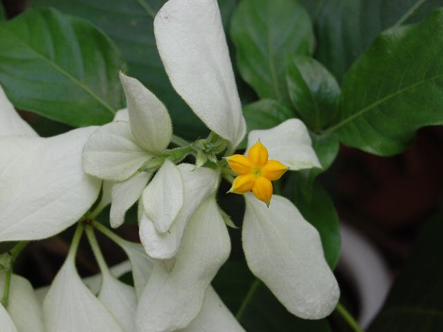 ムッサエンダ・フィリピカ 夏の花 2013年08月11日 ムッサエンダ・フィリピカはアカネ科コンロンカ属の蔓性常緑低木である。コンロンカ属は熱帯アジアやアフリカに200種くらいが分布する蔓性の常緑低木である。本種の原産地はフィリピンやニューギニアである。熱帯地方では街路樹や庭木とされるが、日本では温室で植栽される。樹高は2~5メートルである。葉は楕円形で、向かい合って生える(対生)。葉には軟らかい毛が生える。開花時期は6~9月くらいである。花弁状の白い大きな萼片に特徴がある。漏斗状で先が5つに裂けた小さな黄色い花をつける。園芸品種が多く、萼片の色はピンクや赤のものもある。花の後にできる実は液果(果皮が肉質で液汁が多い実)である。属名の Mussaenda はスリランカでの現地名からきている。種小名の philippica は「フィリピンの」という意味である。写真は10月に川口市立グリーンセンターで撮った。学名:Mussaenda philippica★崑崙花思わすような姿だが 違いはどこと興味の湧いて花図鑑植物図鑑|味の麺匠戸田久|おこめの鬼平|フロム蔵王|花の本屋さん|楽天トラベル|
