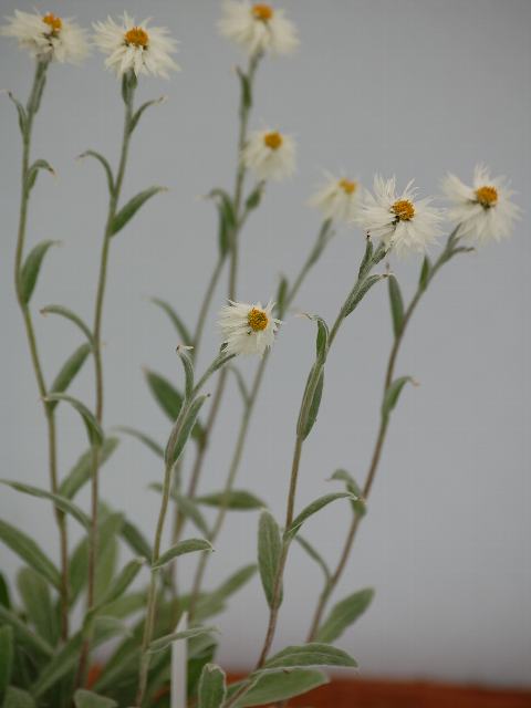 コダマギク 夏の花 2013年08月12日 コダマギクはキク科ヤマハハコ属の多年草である。ヒマラヤ山脈の固有種である。中国の南西部からアフガニスタンにかけて分布し、高山の岩礫地に生える。アナファリス・トリプリネルビスの変種である。この変種にだけ和名があるのが不思議だが、恐らく日本の学者が何らかの関与しているのであろう。和名といっても一般に知られているわけではないので、漢字でどう書くのかもわからない。学名のアナファリス・トリプリネルビス・モノケファラで表示するものもある。草丈は40~60センチくらいである。葉は披針形(笹の葉のような形)で、互い違いに生える(互生)。葉には灰白色の軟毛が生える。開花時期は7~8月である。茎先に散房花序(柄のある花がたくさんつき、下部の花ほど柄が長いので花序の上部がほぼ平らになる)を出し、白い苞に包まれた黄色い花(頭花)をつける。頭花には舌状花はなく、筒状花だけからなる。属名の Anaphalis はギリシャ語の「Gnaphalium(ハハコグサ)」からきている。語中の文字を並べ替えて作った。種小名の triplinervis は「3つの脈のある」という意味である。変種名の monocephala は「一輪咲きの」という意味である。写真は5月に神代植物公園の野草展(東京山草会)で撮った。学名:Anaphalis triplinervis var. monocephala★ヒマラヤの岩場に生えるモノケファラ ドライフラワー思わすように花図鑑植物図鑑|味の麺匠戸田久|おこめの鬼平|フロム蔵王|花の本屋さん|楽天トラベル|PR