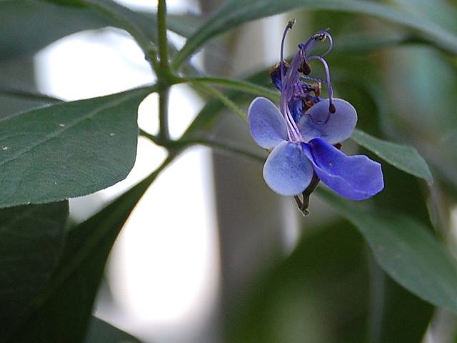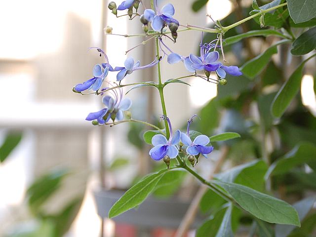クレロデンドルム・ウガンデンセ 夏の花 2013年08月03日 クレロデンドルム・ウガンデンセはクマツヅラ科クサギ属(クレロデンドルム属)の蔓性常緑低木である。原産地は東アフリカのウガンダなどである。樹高は1~3メートルくらいである。葉は楕円形で、向かい合って生える(対生)。葉の縁には粗いぎざぎざ(鋸歯)がある。開花時期は7~10月くらいである。葉の脇に集散花序(最初の花が枝先につき、その下に次々と側枝を出して花がつく)を出し、花径2センチくらいの青紫色の花をたくさんつける。花冠は5つに裂ける。脇につく4枚の裂片の色は淡い。真ん中の裂片は濃い青紫色で内側に巻いて袋状となる。花の後にできる実は核果(水分を多く含み中に種が1つある)である。英名はブルーバタフライブッシュ(blue butterfly bush)という。属名の Clerodendrum はギリシャ語の「cleros(運命)+dendron(樹木)」に由来する。スリランカにあった同属の2種を「幸運の木」「不運の木」と呼んだことからきている。種小名の ugandense は「ウガンダの」という意味である。写真は10月に神代植物公園で撮った。学名:Clerodendrum ugandense★動きある花の姿が面白い ウガンデンセは蝶舞うごとく花図鑑植物図鑑|味の麺匠戸田久|おこめの鬼平|フロム蔵王|花の本屋さん|楽天トラベル|