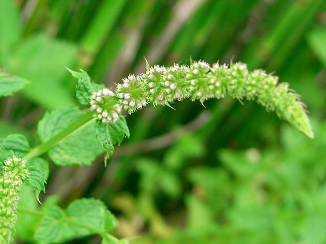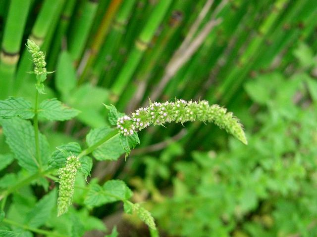 パイナップルミント 夏の花 2013年08月05日 丸葉薄荷(マルバハッカ)はシソ科ハッカ属の多年草である。ヨーロッパから西アジアにかけて分布する。英名をアップルミント(apple mint)という。パイナップルミント(pineapple mint)はその園芸品種である。特徴はかすかなパイナップルのような香りがあり、葉に斑が入ることである。アップルミントのほうは斑が入らない。そのため本種は別名で斑入りアップルミント(フイリアップルミント)とも呼ばれる。草丈は30センチから80センチくらいである。地下茎を伸ばして繁殖する。茎の切り口は四角形で、細かな毛で覆われている。葉は十字状に向かい合って生える(対生)。葉に柄はなく、茎を抱く。形は幅広い楕円形で、縁にはぎざぎざ(鋸歯)がある。葉脈はへこんでいて皺が目立ち、白ないしクリーム色の斑が入る。裏面は柔らかな毛で覆われ、香りの成分を出す腺点がある。開花時期は7~9月である。茎先に総状花序(柄のある花が花茎に均等につく)を出し、白ないし紫色の小さな唇形の花を穂状に咲かせる。雄しべは4本あり、そのうち2本が長い。花の後にできる実は分果(複数の子房からできた果実)である。葉はハーブティーやサラダなどに利用される。属名の Mentha はギリシャ神話に登場するニンフ「メンテ(Menthe)」の名からきている。種小名の suaveolens は「甘い香りがする」という意味である。品種名の Variegata は「斑入りの」という意味である。写真は7月に野田市の清水公園で撮った。学名:Mentha suaveolens 'Variegata'★目立たない花だねなんて言わないで 香りもいいし葉も美しい花図鑑植物図鑑|味の麺匠戸田久|おこめの鬼平|フロム蔵王|花の本屋さん|楽天トラベル|