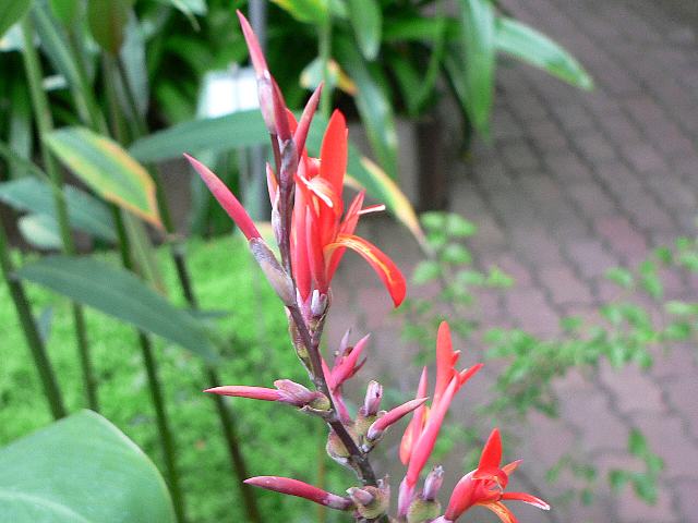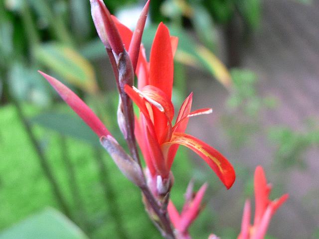 檀特(ダンドク) 夏の花 2013年08月06日 檀特(ダンドク)はカンナ科カンナ属の多年草である。原産地はカリブ諸島やメキシコである。中国名を曇華(ドンゲ)という。カンナの原種である。日本へは江戸時代の初期に渡来した。本州の関東地方以南で逸出したものが野生化している。草丈は2メートルくらいである。葉は長い楕円形で、互い違いに生える(互生)。葉の先は尖り、縁にぎざぎざ(鋸歯)はない。開花時期は5~10月である。温室では周年開花をする。茎先に総状花序(柄のある花が花茎に均等につく)を出し、赤ないし黄色の花をつける。品種改良されたカンナに比べると、花は小さい。この花弁のように見える部分は、雄しべが弁化したものである。花弁は3枚あるが筒状の披針形で目立たない。萼片も3枚で小さい。花の後にできる実はさく果(熟すると下部が裂け、種子が散布される果実)である。属名の Canna は、ケルト語の「can(芦)」が転じてこの属の名に使われた。種小名の indica は「インドの」という意味である。写真は5月に北大植物園で撮った。学名:Canna indica★鮮やかな朱染めの色が目を引くよ 檀特の花原始の叫び花図鑑植物図鑑|味の麺匠戸田久|おこめの鬼平|フロム蔵王|花の本屋さん|楽天トラベル|