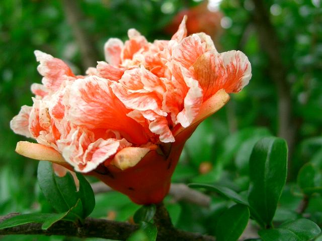 花石榴(ハナザクロ) 夏の花 2013年07月20日 石榴(ザクロ)はザクロ科ザクロ属の落葉小高木である。原産地は地中海沿岸から西アジアにかけた地域である。樹高は5メートルほどになる。枝分かれが多く、棘がある。葉は長い楕円形で、互い違いに生える(互生)。葉には艶がある。開花時期は6~7月である。5センチくらいの筒状をした六弁花をつける。観賞用の品種で八重咲きのものを花石榴(ハナザクロ)と呼んでいる。残念ながら実はならない。属名の Punica はラテン語の「punicus(カルタゴの)」からきている。ザクロの産地と考えたものと思われる。種小名の granatum は「粒状の」という意味である。品種名の Pleniflora は「八重咲きの花の」という意味である。写真は6月に野田市の清水公園で撮った。紅白の絞りで五彩榴(ゴサイリュウ)という品種である。学名:Punica granatum 'Pleniflora'★紅白の絞りの色も鮮やかに 花石榴咲く仇花なれど花図鑑植物図鑑|味の麺匠戸田久|おこめの鬼平|フロム蔵王|花の本屋さん|楽天トラベル|