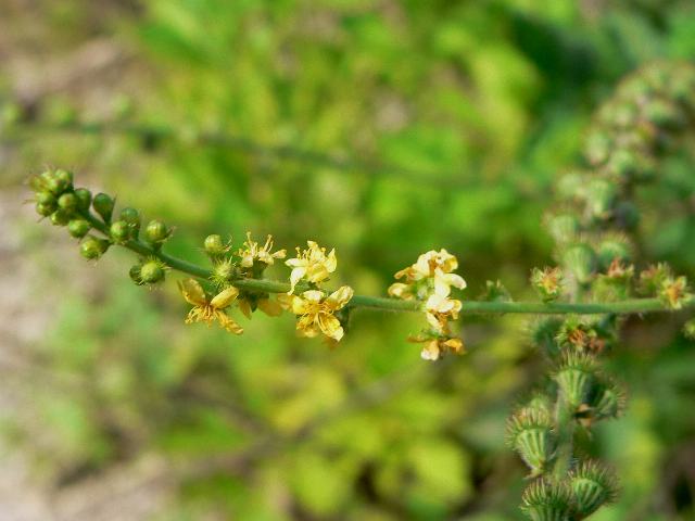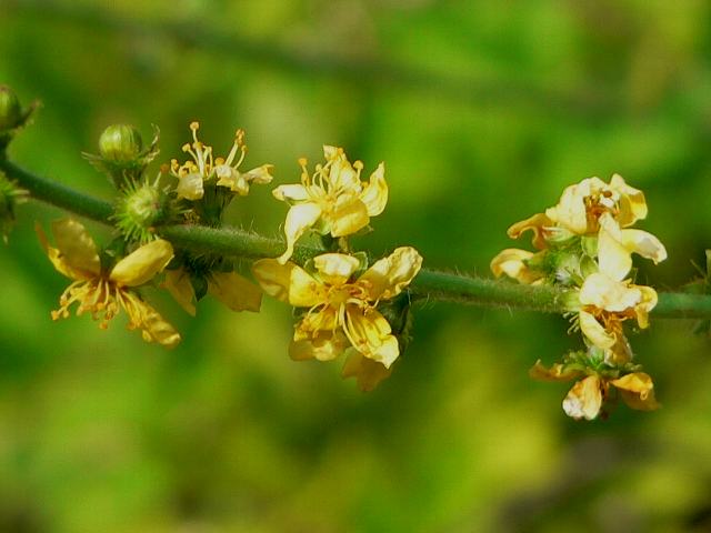西洋金水引(セイヨウキンミズヒキ) 夏の花 2013年07月21日 西洋金水引(セイヨウキンミズヒキ)はバラ科キンミズヒキ属の多年草である。原産地はヨーロッパである。イギリスを含めて広く分布し、草地や荒れ地に生える。英名はアグリモニー(agrimony)という。全草にアプリコットのような甘い香りがある。古代ギリシャの時代から薬草として利用されてきた。打ち身や切り傷の薬となるほか、消化促進などの薬効もある。草丈は40~60センチくらいである。葉は奇数羽状複葉(鳥の羽のように左右に小葉がいくつか並び、先に1つの小葉がついて1枚の葉が構成される)で、互い違いに生える(互生)。小葉の形は披針形(笹の葉のような形)で、縁には粗いぎざぎざ(鋸歯)がある。開花時期は6~9月である。枝先に細長い総状花序(柄のある花が花茎に均等につく)を出し、黄色い小さな花をつける。花弁は5枚、萼片も5枚である。花の後にできる実はさく果(熟すると下部が裂け、種子が散布される果実)である。属名の Agrimonia はギリシャ語の「argemone(アザミゲシ属)」からきている。棘が多くて似ているためだが、転用する際に綴りを間違えたという。種小名の eupatoria は「良き父」という意味である。写真は6月につくば植物園で撮った。学名:Agrimonia eupatoria★なるほどね金水引の仲間なの 似ている花がヨーロッパにも花図鑑植物図鑑|味の麺匠戸田久|おこめの鬼平|フロム蔵王|花の本屋さん|楽天トラベル|