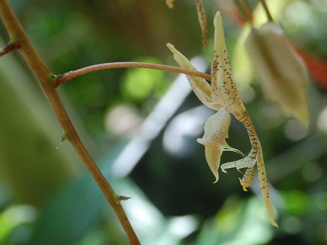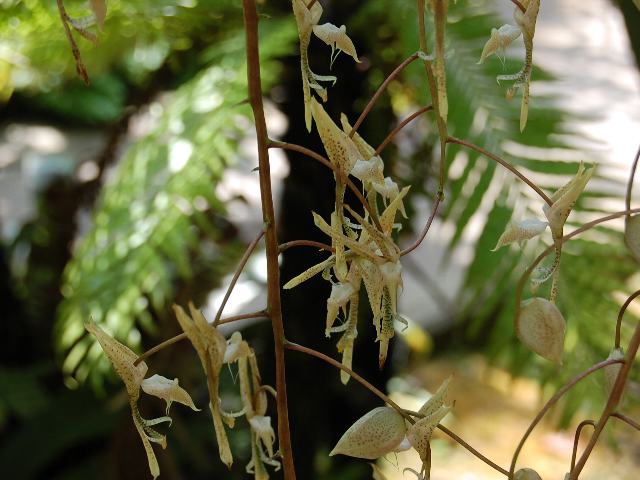 ゴンゴラ・マクラタ 夏の花 2013年07月22日 ゴンゴラ・マクラタはラン科ゴンゴラ属の多年草である。ゴンゴラ属は中南アメリカに25種くらい分布する着生種である。本種の原産地はトリニダード島からペルーにかけてである。草丈は80センチくらいである。葉は披針形(笹の葉のような形)である。開花時期は6~7月である。花茎の先に総状花序(柄のある花が花茎に均等につく)を下垂させ、黄白色の花をたくさんつける。花径は4~5センチで、褐色の斑がたくさん入る。花は短命で、次々と咲く。属名の Gongora はヌエバ・グラナダ(コロンビアとエクアドル)の総督だった「ゴンゴラ(Antonio Caballero y Gongora, 1723-1796)さん」の名からきている。種小名の maculata は「斑点のある」という意味である。写真は7月につくば植物園で撮った。学名:Gongora maculata★きっかいな姿の花にぎょっとする 不思議育む熱帯アメリカ花図鑑植物図鑑|味の麺匠戸田久|おこめの鬼平|フロム蔵王|花の本屋さん|楽天トラベル|