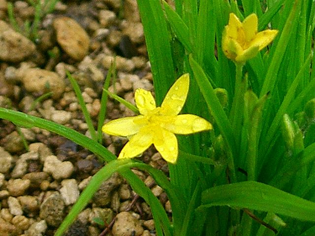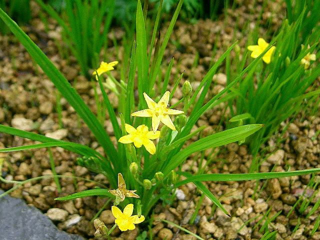 小金梅笹(コキンバイザサ) 夏の花 2013年07月02日 小金梅笹(コキンバイザサ)はキンバイザサ科コキンバイザサ属の多年草である。宮城県以南の本州から沖縄にかけて分布し、山地の草地などに生える。海外では、台湾、中国、ヒマラヤ、インドネシア、マレーシア、インドなどにも分布する。和名の由来は、金梅笹(キンバイザサ)よりも葉が細く小形であることからきている。草丈は20センチくらいである。花茎や花弁、葉には毛が密生している。根際から生える葉は線形である。開花時期は4~7月である。茎先に花径1センチくらいの小さな黄色い花を1~2輪つける。花被片は6枚である。雄しべも6本である。花の後にできる実は長い楕円形のさく果(熟すると下部が裂け、種子が散布される果実)である。属名の Hypoxis はギリシャ語の「hypo(下)+oxys(尖った)」からきている。種小名の aurea は「黄金色の」という意味である。写真は5月に箱根湿生花園で撮った。学名:Hypoxis aurea★細い葉を掻き分け伸ばす花茎に 小金梅笹黄のアクセント花図鑑植物図鑑|味の麺匠戸田久|おこめの鬼平|フロム蔵王|花の本屋さん|楽天トラベル|