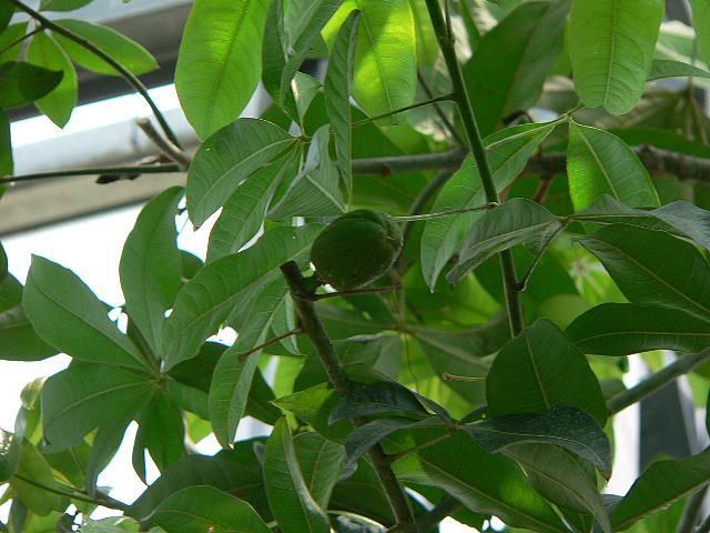 パキラ 夏の花 2013年07月02日 パキラはパンヤ科パキラ属の常緑高木である。分類体系によってはアオイ科とされる。属名のパキラが和名としても採用されている。原産地は中南アメリカである。別名をカイエンナット(Cayenne nut)という。カイエンは仏領ギアナの主要都市の名である。ナッツを採るための果樹として栽培されている。樹高は5~20メートルくらいである。幹はずんぐりとしている。葉は手のひら状の複葉で、互い違いに生える(互生)小葉の形は長い楕円形である。開花時期は5~6月である。大きな緑白色の花を咲かせる。花は夜開いて昼前には散ってしまう。花はよい香りがする。結実時期は9~10月である。花の後にできる実は卵形のさく果(熟すると下部が裂け、種子が散布される果実)で、長さが10~30センチくらいある。茶色に熟し、中にある種子は食用とされる。近年は観葉植物としても人気がある。属名の Pachira はギアナでの現地名からきている。種小名の aquatica は「水生の」という意味である。写真は6月に富山県中央植物園で撮った。学名:Pachira aquatica(=Pachira macrocarpa)★大きな実とても立派なパキラの樹 南国ムード溢れるように花図鑑植物図鑑|味の麺匠戸田久|おこめの鬼平|フロム蔵王|花の本屋さん|楽天トラベル|