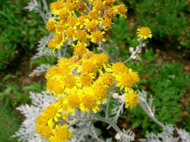 白妙菊(シロタエギク) 夏の花 2013年07月03日 白妙菊(シロタエギク)はキク科キオン属の多年草である。原産地は南ヨーロッパである。英名はダスティーミラー(dusty miller)という。若い苗の葉が美しく、園芸上は一年草として扱われる。草丈は50~100センチくらいである。葉と茎の色はシルバーで、フェルト状の毛が密生して美しい。葉は羽状に裂け、互い違いに生える(互生)。開花時期は6~8月である。茎先に集散花序(枝先に花がつき、その下から枝が出て花をつけることを繰り返すもの)を出し、キク科特有の黄色い小さな花(頭花)をたくさんつける。花の後にできる実はそう果(熟しても裂開せず、種子は1つで全体が種子のように見えるもの)である。属名の Senecio はラテン語の「senex(老人)」からきている。灰白色の毛や白い冠毛のあるものが多いことから名づけられた。種小名の bicolor は「二色の」という意味である。亜種名の cineraria は「シネラリア属(Cineraria)のような」という意味である。写真は7月に野田市の清水公園で撮った。学名:Senecio bicolor subsp. cineraria★妙なるは葉や茎のみにあらざると 花咲かせたり白妙菊は花図鑑植物図鑑|味の麺匠戸田久|おこめの鬼平|フロム蔵王|花の本屋さん|楽天トラベル|