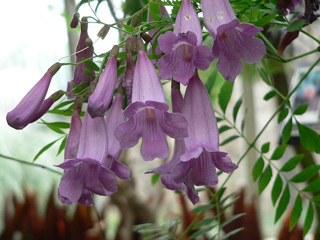 ジャカランダ・プベルラ 夏の花 2013年06月22日 ジャカランダ・プベルラはノウゼンカズラ科キリモドキ属の常緑低木ないし高木である。キリモドキ属は南アメリカに50種くらいが分布する。本種の原産地はブラジル、パラグアイ、アルゼンチンである。一般名はカロベイラ(carobeira)という。樹高は3~10メートルである。葉は奇数羽状複葉(鳥の羽のように左右に小葉がいくつか並び、先に1つの小葉がついて1枚の葉が構成される)で、向かい合って生える(対生)。開花時期は5~6月である。花冠は漏斗状で、先が5つに裂ける。花の色は淡い紫色である。花の後にできる実は莢状のさく果(熟すると下部が裂け、種子が散布される果実)である。属名の Jacaranda はブラジルでの呼び名からきている。種小名の puberula は「短い軟毛で覆われた」という意味である。写真は6月に川口市立グリーンセンターで撮った。学名:Jacaranda puberula★鬱蒼と垂れ下がる花ベルのよう 傷みやすいが南国気分花図鑑植物図鑑|味の麺匠戸田久|おこめの鬼平|フロム蔵王|花の本屋さん|楽天トラベル|