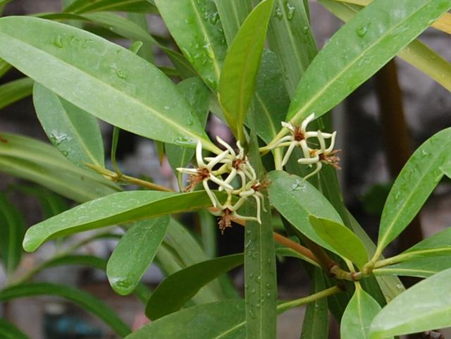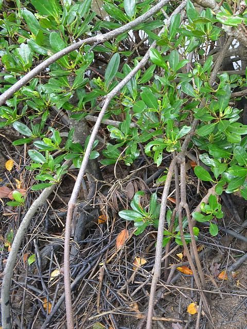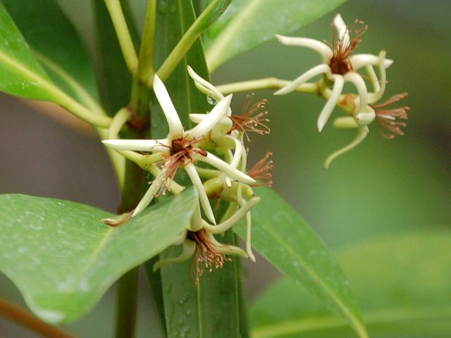 雌蛭木(メヒルギ) 夏の花 2013年06月07日 雌蛭木(メヒルギ)はヒルギ科メヒルギ属の常緑小高木である。漢字では「雌漂木」とも書く。鹿児島県の薩摩半島から沖縄にかけて分布し、海岸地帯の海際に生えるマングローブ植物の1つである。海外では、台湾や中国南部にも分布する。かつては南アジアやオセアニアに分布するものも含めてカンデリア・カンデル(Kandelia candel)として分類されていたが、2003年に南シナ海より北にあるものはカンデリア・オボバタ(Kandelia obovata)として分離された。ただし、写真を撮ったつくば植物園ではカンデリア・カンデルを踏襲している。別名を琉球笄(リュウキュウコウガイ)という。国際自然保護連合(IUCN)のレッドリスト(Ver. 3.1, 2001)では軽度懸念(LC)に指定されている。日本での樹高は5~8メートルくらいである。幹は直立をする。樹皮は濃い赤褐色である。成木は幹の周囲に呼吸根を持ち、干潟の泥地に株立ちする。葉は長い楕円形で、向かい合って生える(対生)。葉の質は革質で艶があり、葉の先は丸い。開花時期は5~6月である。葉の脇に集散花序(茎先に花がつき、少し下から横枝が出てその先にも花がつく)を出し、白い花を10個くらいつける。花は糸状の5枚の花弁と細長い5枚の萼片をもつ。花弁は2つに裂け、裂片の先はさらに細く裂ける。萼片は後ろに反り返る。花の後には卵形の実をつけ、「胎生種子」を育てる。属名の Kandelia はインドの現地語(マラヤーラム語)での呼び名(kandel)からきている。種小名の obovata は「倒卵形の」という意味である。写真は5月につくば植物園で撮った。3枚目は沖縄県東村の慶佐次地区で撮った。学名:Kandelia obovata(=Kandelia candel)★雌蛭木の花はこれかとレンズ寄せ マングローブの不思議を思う花図鑑植物図鑑|味の麺匠戸田久|おこめの鬼平|フロム蔵王|花の本屋さん|楽天トラベル|