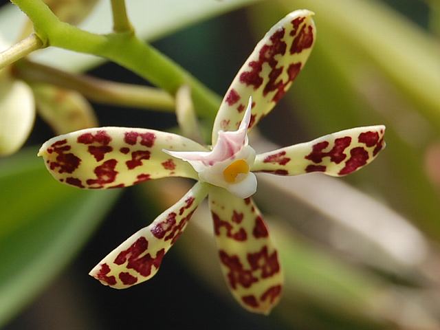 エンキクリア・パンテラ 春の花 2013年06月08日 エンキクリア・パンテラはラン科エンキクリア属の多年草である。属名の読み方は「エンシクリア」とするものもある。エンキクリア属は中南アメリカに1000種以上分布する着生種である。分類の仕方によっては、エピデンドルム属(Epidendrum)に統合されることもある。本種の原産地はメキシコ、グアテマラである。標高1300~2100メートルの高地の林の中に生える着生種である。種小名の読み方は「パンセラ」とするものもある。異名をプロステケア・パンテラ(Prosthechea panthera)という。草丈は20センチくらいである。葉は披針形(笹の葉のような形)で革質である。開花時期は冬から春である。茎先に総状花序(柄のある花が花茎に均等につく)を出し、緑白色で紅紫色の豹のような斑点のあるの花を数輪つける。唇弁の色は白い。花径は25ミリくらいで、よい香りがする。属名の Encyclia はギリシャ語の「enkykleomai(取り囲む)」からきている。種小名の panthera は「ヒョウ属のような」という意味である。写真は6月につくば植物園で撮った。学名:Encyclia panthera★豹柄で個性を見せるパンテラは きっと受けるよ大阪人に花図鑑植物図鑑|味の麺匠戸田久|おこめの鬼平|フロム蔵王|花の本屋さん|楽天トラベル|