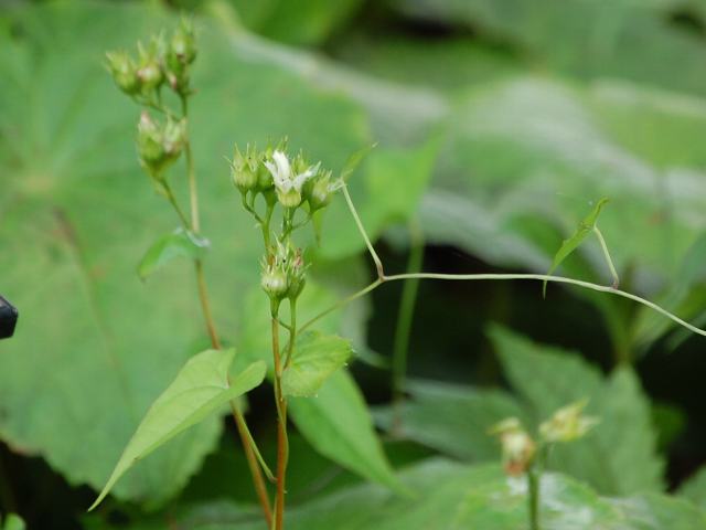 八幡草(ヤワタソウ) 夏の花 2013年06月09日 八幡草(ヤワタソウ)はユキノシタ科ヤワタソウ属の多年草である。本州の東北地方南部から中部地方にかけて分布し、山地の谷沿いなど湿り気の多い場所に生える。海外では、中国にも分布する。草丈は30~60センチくらいである。地下茎は太い。根際からは長い柄のある1~2枚の葉が生える。葉の形は円形ないし卵円形で、縁は手のひら状に浅く裂ける。茎につく葉は小さく、数枚が互い違いに生える(互生)。開花時期は5~7月である。茎先に集散花序(最初の花が枝先につき、その下に次々と側枝を出して花がつく)を出し、黄白色の小さな花をいくつかつける。花弁は5枚で、平開はしない。萼筒は浅い鐘形である。雄しべは10本である。花の後にできる実はさく果(熟すると下部が裂け、種子が散布される果実)である。和名の由来は不明とされている。属名の Peltoboykinia はギリシャ語の「pelto(楯状の)+Boykinia(アラシグサ属)」からきている。種小名の tellimoides はユキノシタ科の「テリマ属(Tellima)に似た」という意味である。写真は7月に仙台市野草園で撮った。学名:Peltoboykinia tellimoides★薄闇に花も目立たぬ八幡草 艶のある葉が存在示し花図鑑植物図鑑|味の麺匠戸田久|おこめの鬼平|フロム蔵王|花の本屋さん|楽天トラベル|