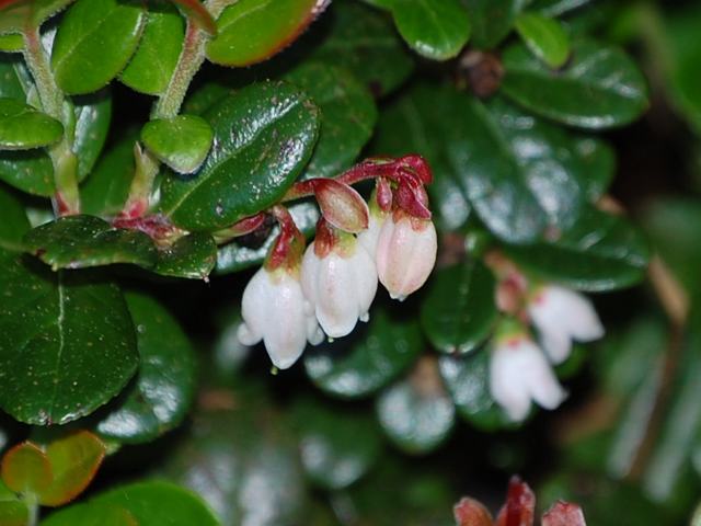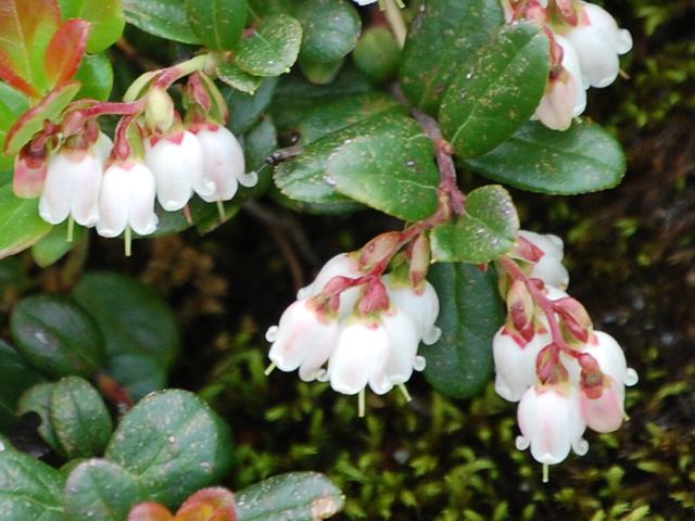苔桃(コケモモ) 夏の花 2013年06月10日 苔桃(コケモモ)はツツジ科スノキ属の常緑小低木である。北方領土を含む北海道から九州にかけて分布し、高山ないし亜高山の日当たりの良い岩場や砂礫地に生える。海外では、朝鮮半島、サハリンのほか周北極地域に広く分布する。樹高は10センチくらいである。地を這ってマット状に広がる。葉は楕円形で、互い違いに生える(互生)。硬くて光沢があり、真ん中の葉脈が目立つ。葉の縁にぎざぎざ(鋸歯)はない。開花時期は5~7月である。枝先に紅色を帯びた鐘状の花を数個下向きにつける。花の先は4つに裂けている。実は直径1センチくらいの球形の液果(果皮が肉質で液汁が多い実)で、秋になると赤く熟する。酸味があって、生食するほか、果実酒やジャムなどにする。利尿効果や尿路殺菌作用があるという。和名は、地面を這う様子を「苔」にたとえたものである。「モモ」は方言で「木の実」のことだという。北海道では、アイヌ語のフレップ(赤い実)の名で知られている。属名の Vaccinium はラテン語の「vaccinus(牝牛の)」からきているが、関係は不明だという。種小名の vitis-idaea はギリシャ神話に出てくる「クレタ島のイダ山(Ida)のブドウ」という意味である。写真は7月に長野県駒ヶ根市の千畳敷カールで撮った。学名:Vaccinium vitis-idaea★やがてくる実りの秋に思い馳せ 薄紅の花地を見つめ咲く花図鑑植物図鑑|味の麺匠戸田久|おこめの鬼平|フロム蔵王|花の本屋さん|楽天トラベル|