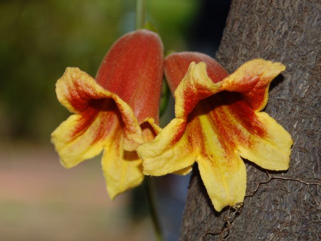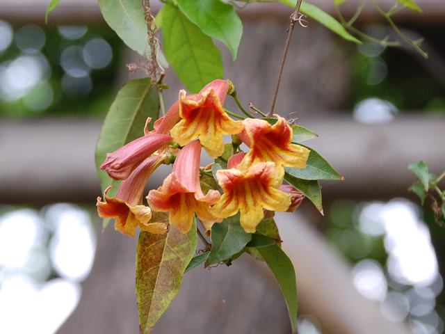 釣鐘葛(ツリガネカズラ) 夏の花 2013年05月29日 釣鐘葛(ツリガネカズラ)はノウゼンカズラ科ツリガネカズラ属の常緑蔓性低木である。原産地は北アメリカの南部である。枝は10メートルくらい伸びる。葉は長い楕円形で、向かい合って生える。開花時期は4~6月である。葉の脇に橙赤色をした釣鐘状の花を数輪ずつつける。花の後にできる実はさく果(熟すると下部が裂け、種子が散布される果実)である。花の色や香りがカレーに近いので、カレーバインという流通名もある。属名の Bignonia はフランスの聖職者でルイ14世の司書だった「ビニョン(Jean-Paul Bignon, 1662-1743)さん」の名からきている。種小名の capreolata は「巻鬚のある」という意味である。写真は5月に川口市立グリーンセンターで撮った。学名:Bignonia capreolata★ぶら下がる釣鐘葛を写そうと 近づきみれば微かな香り花図鑑植物図鑑|味の麺匠戸田久|おこめの鬼平|フロム蔵王|花の本屋さん|楽天トラベル|