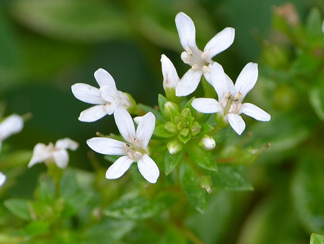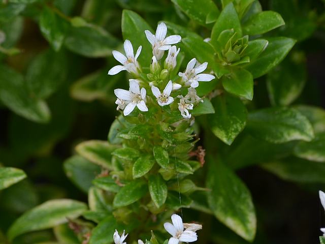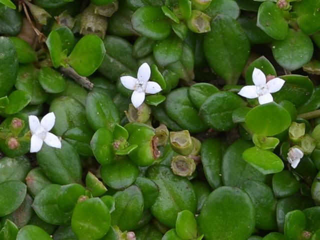 磯馴葎(ソナレムグラ) 夏の花 2013年05月31日 磯馴葎(ソナレムグラ)はアカネ科フタバムグラ属の多年草である。本州の千葉県から沖縄県にかけて分布し、海岸の岩場に生える。海外では、朝鮮半島、台湾、中国、フィリピン、インド、南太平洋などにも分布する。「磯馴」は磯に生えることを意味し、「葎」は生い茂る雑草のことである。草丈は5~20センチくらいである。茎は枝分かれをし、地を這って広がる。葉は卵形で、向かい合って生える(対生)。葉は多肉質で艶がある。開花時期は7~9月くらいだが、沖縄ではほぼ周年開花をする。茎先に花径4ミリくらいの白い小さな花をつける。花冠は筒状で先が4つに裂ける。花冠の真ん中は白い毛で覆われている。花の後にできる実はさく果(熟すると下部が裂け、種子が散布される果実)である。属名の Hedyotis はギリシャ語の「hedys(甘い)+otos(耳)」からきている。種小名の strigulosa は「硬く尖り、ざらざらした面の」という意味である。種小名の parvifolia は「小さな葉の」という意味である。写真は5月に沖縄本島の辺戸岬で撮った。学名:Hedyotis strigulosa var. parvifolia★撮った花ヒント見つけて解き明かす 旅の後にはそんな楽しみ花図鑑植物図鑑|味の麺匠戸田久|おこめの鬼平|フロム蔵王|花の本屋さん|楽天トラベル|