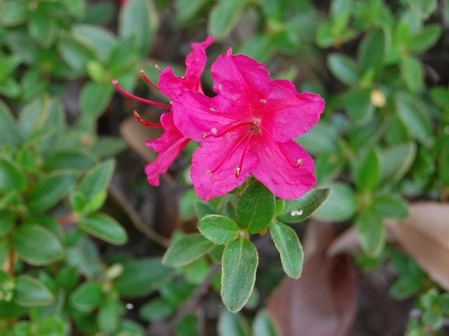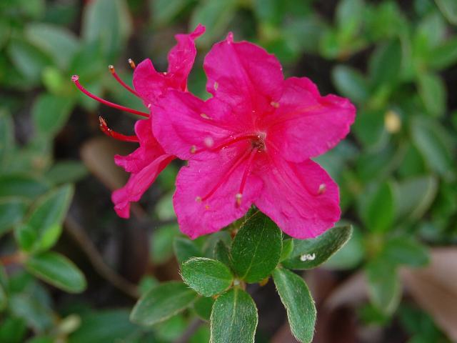 深山霧島(ミヤマキリシマ) 春の花 2013年05月18日 深山霧島(ミヤマキリシマ)はツツジ科ツツジ属の常緑小低木である。九州の山地にのみ自生し、瓦礫地に群落を形成する。雲仙、阿蘇、九重、霧島などには大群落がある。長崎県、鹿児島県では県花にもなっている。樹高は10~100センチくらいである。葉は長さが1~2センチの長い楕円形で、互い違いに生える(互生)が、枝先に集まってつくので輪生しているように見える。葉の先は尖り、縁にぎざぎざ(鋸歯)はない。葉には毛が生えている。開花時期は4~6月である。枝先に散形花序(枝先に1個つずつ花がつく)を出し、紅紫色や桃色の小さな花を2~3輪つける。花径は2~3センチである。花冠は漏斗状で先が5つに裂け、横に開く。上部の裂片り内側には細かい斑の入るものと入らないものがある。萼片は5枚である。雄しべは5本、雌しべは1本である。花の後にできる実はさく果(熟すると下部が裂け、種子が散布される果実)である。属名の Rhododendron はギリシャ語の「rhodon(バラ)+dendron(樹木)」からきている。紅色の花をつける木という意味で名づけられた。種小名の kiusianum は「九州の」という意味である。写真は5月に埼玉県立花と緑の振興センターで撮った。学名:Rhododendron kiusianum★霊峰に咲くが似合いの花姿 深山霧島真っ赤に燃えて花図鑑植物図鑑|味の麺匠戸田久|おこめの鬼平|フロム蔵王|花の本屋さん|楽天トラベル|