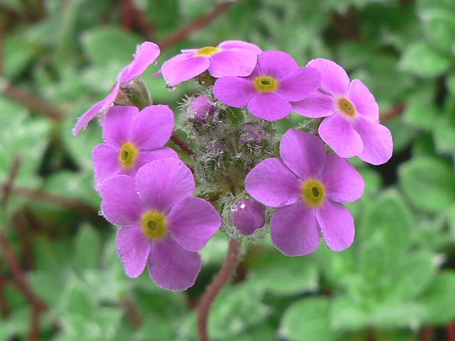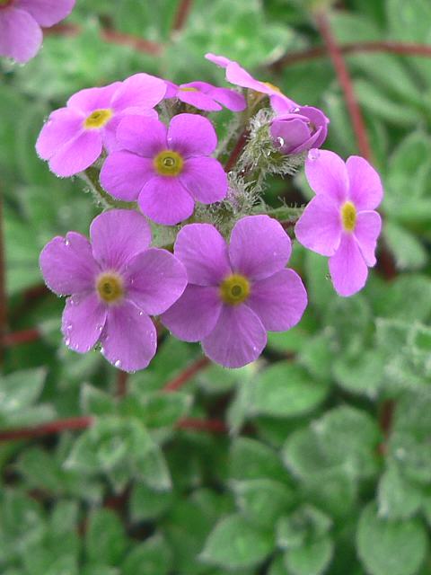 蔓花形(ツルハナガタ) 春の花 2013年05月20日 蔓花形(ツルハナガタ)はサクラソウ科トチナイソウ属(アンドロサケ属)の多年草である。属名の読み方は「アンドロサセ」とするものもある。アンドロサケ属は主に北半球の山岳地帯に自生し、100種類くらいあるという。日本にも栃内草(トチナイソウ)などが分布するので、属名の和名を「トチナイソウ属」という。本種の原産地はヒマラヤである。シッキム地方からカシミール地方にかけて分布し、標高2800~4000メートルの山の斜面などに生える。英名はロックジャスミン(rock jasmine)である。草丈は10~20センチくらいである。茎は地面を這って伸びる。葉は楕円形で、ロゼット状となる。葉にはわずかに毛が生える。日本での開花時期は4~5月である。自生地では7~8月に咲く。茎先に散形花序(枝先に1個つずつ花がつく)を出し、花径は1センチに満たない小さなピンクの花をつける。花冠は5枚に分かれて真ん中は黄色い。花の後にできる実はさく果(熟すると下部が裂け、種子が散布される果実)である。チベットでは全草を薬用とし、炎症に効く。属名の Androsace はギリシャ語の「andros(雄)+sakos(楯)」からきている。種小名の sarmentosa は「蔓性の」という意味である。写真は5月に六甲高山植物園で撮った。学名:Androsace sarmentosa★びっしりとピンクの花をつけて咲く 蔓花形は乙女の色香花図鑑植物図鑑|味の麺匠戸田久|おこめの鬼平|フロム蔵王|花の本屋さん|楽天トラベル|
