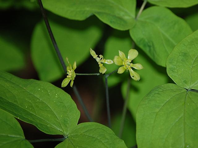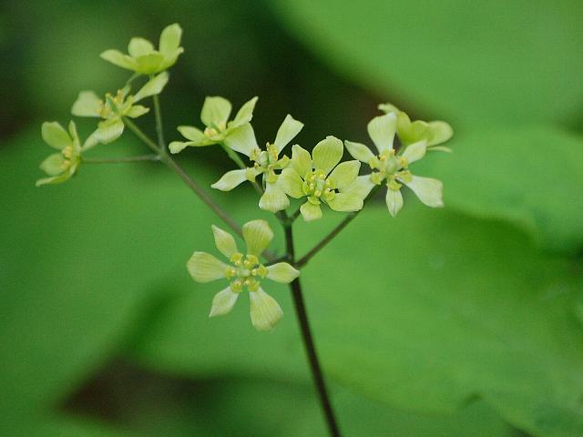 類葉牡丹(ルイヨウボタン) 春の花 2013年05月13日 類葉牡丹(ルイヨウボタン)はメギ科ルイヨウボタン属の多年草である。北海道から九州にかけて分布し、平地や山地の林の中や林の縁に生える。海外では、朝鮮半島、中国、サハリン、ウスリーなどにも分布する。和名の由来は、葉が牡丹(ボタン)に似ることからきている。草丈は40~60センチくらいである。根茎は横に這い、茎は直立をする。葉は2~3回3出複葉で、互い違いに生える(互生)。いわゆる三つ葉を2~3回繰り返して1枚の葉となる。小葉の形は長めの卵形で、先が3つに浅く裂けるものもある。葉の質は薄く、縁にぎざぎざ(鋸歯)はない。開花時期は4~6月である。茎先や葉の脇に円錐花序(下のほうになるほど枝分かれする回数が多く、全体をみると円錐形になる)を出し、花径1センチくらいの淡い黄緑色の花をつける。6枚の花びらのように見えるのは萼片である。6枚の実際の花弁は花の真ん中近くにあり、蜜線となっている。雄しべは6本、雌しべは1本である。花の後には青い果実状の種子がつき、秋に藍色に熟する。子房が膨らまず裸の種子が実のようになっているのである。属名の Caulophyllum はコロンビアの「caulos(茎)+phyllum(葉)」からきている。茎が大きく広がる葉の柄のように見えることから名づけられた。種小名の robustum は「大形の」という意味である。写真は4月に箱根湿生花園で撮った。学名:Caulophyllum robustum★めずらしい名前は葉っぱにちなむけど 花も実もなる類葉牡丹花図鑑植物図鑑|味の麺匠戸田久|おこめの鬼平|フロム蔵王|花の本屋さん|楽天トラベル|