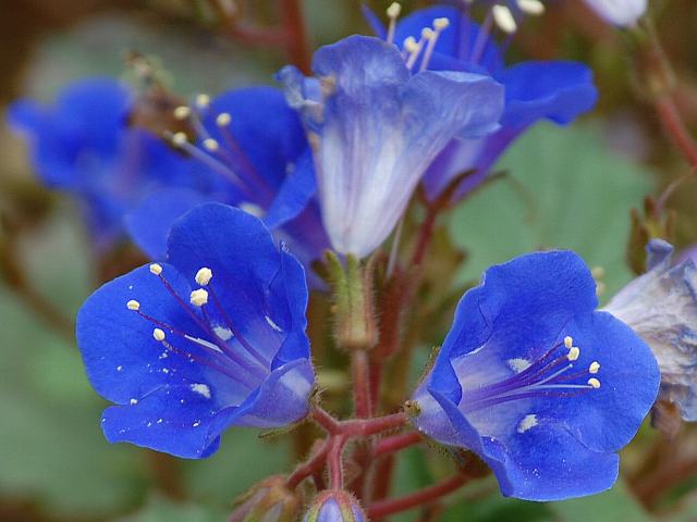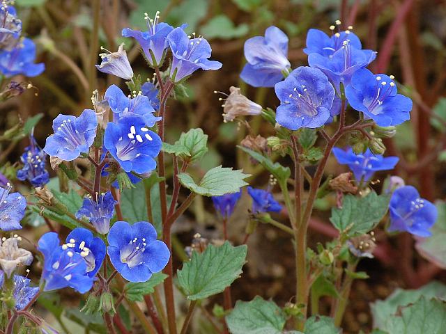 ファケリア・カンパヌラリア 春の花 2013年05月15日 ファケリア・カンパヌラリアはハゼリソウ科ハゼリソウ属の一年草である。分類体系によってはムラサキ科とされる。属名の読み方は「ファセリア」とするものもある。葉芹草(ハゼリソウ:Phacelia tanacetifolia)の近縁種である。ハゼリソウ属は南北アメリカに100種くらいが分布する。本種の原産地は北アメリカのカリフォルニア州やアリゾナ州で、砂礫地に生える。英名はカリフォルニア・ブルーベル(California bluebell)である。草丈は15~30センチくらいである。葉は卵円形で、互い違いに生える(互生)。葉の縁には粗いぎざぎざ(鋸歯)があり、不規則に深く切れ込む。葉には長い柄がある。開花時期は4~6月である。茎先に集散花序(枝先に花がつき、その下から枝が出て花をつけることを繰り返すもの)を出し、花径3センチくらいの濃い青色の花をつける。花冠は鐘状で、先は5つに裂ける。雄しべは5本で、白い葯(雄しべの花粉を入れる袋)が目立つ。花の後にできる実はさく果(熟すると下部が裂け、種子が散布される果実)である。属名の Phacelia はギリシャ語の「phakelos(束)」からきている。茎先に多くの花をつけることから名づけられた。種小名の campanularia は「鐘形の」という意味である。写真は5月に神奈川県立フラワーセンター大船植物園で撮った。学名:Phacelia campanularia★アリゾナの砂漠に生えるブルーベル 雄しべが目立ち風鈴のよう花図鑑植物図鑑|味の麺匠戸田久|おこめの鬼平|フロム蔵王|花の本屋さん|楽天トラベル|