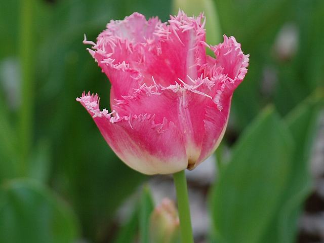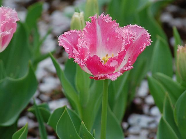 ファンシーフリルス 春の花 2013年05月06日 チューリップはユリ科チューリップ属の多年草である。原産地は地中海沿岸地方から中央アジアにかけた一帯である。17世紀のオランダで熱狂的なブームを巻き起こした。今日では園芸品種の数は4000種を超えるという。ファンシーフリルス(Fancy Frills)もその中の1つである。中生咲き(4月中旬から5月上旬)のフリンジ咲き(FR:Fringed Group)に含まれる。花弁の縁がフリンジ状になっている品種である。草丈は中茎(40センチから55センチ)である。根際から生える葉は帯状である。花の色はピンクで縁がフリンジ状になり、花被片の底が白い。写真は4月に国営昭和記念公園で撮った。学名:Tulipa 'Fancy Frills'★フリンジの可愛さ引き立つ花の色 踊るがごとく風に吹かれて花図鑑植物図鑑|味の麺匠戸田久|おこめの鬼平|フロム蔵王|花の本屋さん|楽天トラベル|