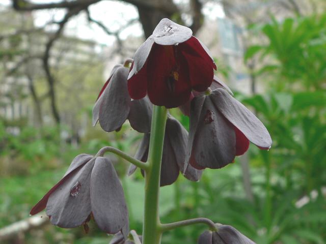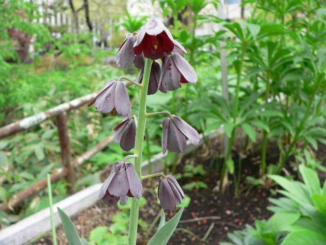 フリティラリア・ペルシカ 春の花 2013年05月11日 フリティラリア・ペルシカはユリ科バイモ属の多年草である。バイモ属はAPG分類体系でもユリ科とされる。属名の読み方は「フリチラリア」とするものもある。原産地は西アジアである。トルコ、イラン、ヨルダンなどに分布し、山地の石の多い斜面に生える。草丈は80センチから100センチくらいである。茎は太く、直立をする。葉は披針形(笹の葉のような形)で、互い違いに生える(互生)。葉の色は灰緑色である。開花時期は4月から5月である。茎先に総状花序(柄のある花が花茎に均等につく)を出し、15輪から20輪くらいの鐘形をした花を下向きにつける。花の色は黒紫色である。花径は2~3センチで、花被片は6枚である。花の雰囲気は北海道産の黒百合(クロユリ)とよく似ている。花の後にできる実はさく果(熟すると下部が裂け、種子が散布される果実)である。属名の Fritillaria はラテン語の「fritillus(チェッカー盤)」からきている。この属の1種の花の模様から名づけられた。種小名の persica は「ペルシャの」という意味である。写真は5月に北大植物園で撮った。学名:Fritillaria persica★ペルシカの醸すムードはアラベスク ベールの中に秘密隠すや花図鑑植物図鑑|味の麺匠戸田久|おこめの鬼平|フロム蔵王|花の本屋さん|楽天トラベル|