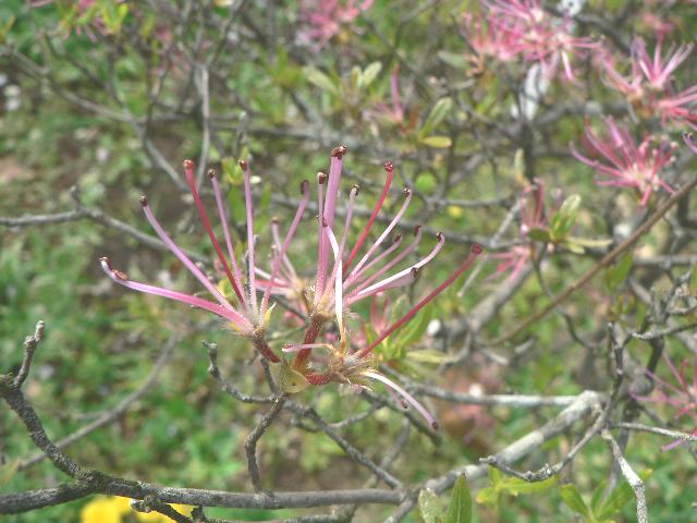 蘂咲き愛鷹躑躅(シベザキアシタカツツジ) 未選択 2016年05月07日 愛鷹躑躅(アシタカツツジ)はツツジ科ツツジ属の落葉低木である。ツツジ属は世界に1000種以上が分布し、また多くの園芸品種がある。愛鷹躑躅(アシタカツツジ)は日本固有種である。静岡県だけに分布するフォッサマグナ要素の植物で、愛鷹山や天子岳に生える。純粋種は800メートルから1500メートルの高さに分布する。本種はその園芸品種である。特徴は花びらがなく、紅色の10本の雄しべと雌しべだけの花が咲くことである。樹高は2メートルから3メートルである。葉は幅の広い披針形で、互い違いに生える(互生)。葉の縁に褐色の毛が生える。 開花時期は5月から6月である。属名の Rhododendron はギリシャ語の「rhodon(バラ)+dendron(樹木)」からきている。紅色の花をつける木という意味で名づけられた。種小名の komiyamae は採集者の「小宮山富太郎さんの」という意味である。写真は4月に小石川植物園で撮った。学名:Rhododendron komiyamae 'Shibezaki'★どのように生まれた花か興味湧く 見つけた花か造った花か花図鑑植物図鑑ミラーサイト|味の麺匠戸田久|おこめの鬼平|フロム蔵王|花の本屋さん|楽天トラベル|