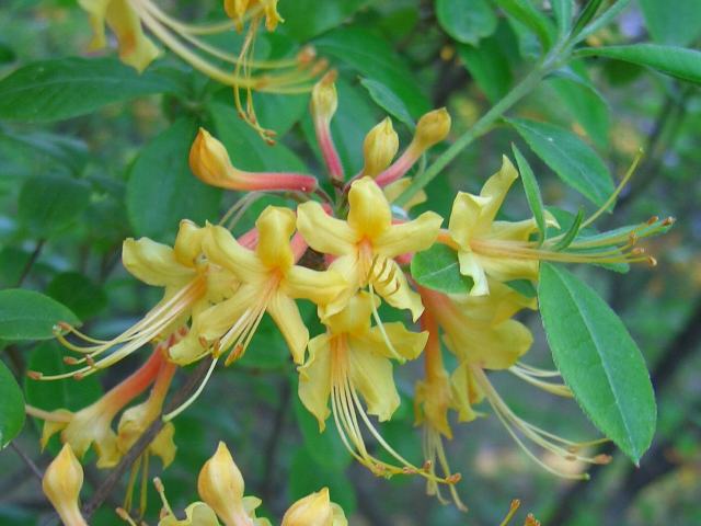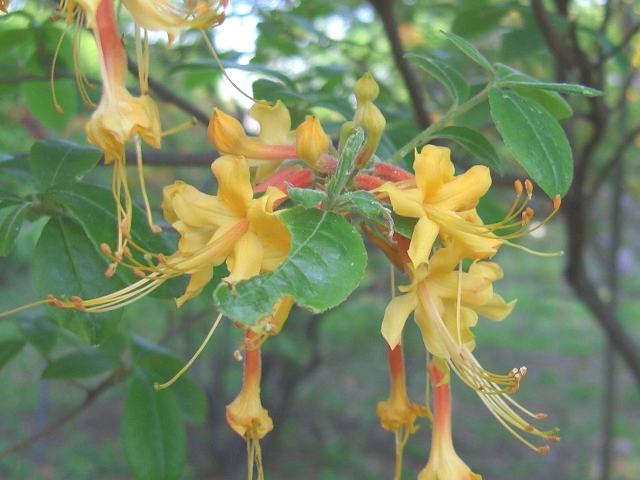 フロリダアザレア 春の花 2016年05月08日 フロリダアザレア(Florida azalea)はツツジ科ツツジ属の落葉低木である。ツツジ属は世界に1000種以上が分布し、また多くの園芸品種がある。本種の原産地は北アメリカである。アメリカ合衆国南部のアラバマ州、フロリダ州、ジョージア州、ミシシッピ州に分布し、湿った林や河岸などに生える。なお、表記の名はアメリカでの一般名であり、オレンジアザレア(orange azalea)などの呼称も用いられている。日本では学名のロードデンドロン・アウストリヌムで表示するものもある。樹高は2メートルから3メートルくらいである。枝は細く、よく枝分かれをする。葉は楕円形で、互い違いに生える(互生)。葉には軟らかい毛が生える。開花時期は4月から5月である。葉の展開に先立って花を咲かせる。花径は3センチから4センチで、花の色は黄色、橙色、桃色などである。花冠は漏斗状で先が5つに裂け、長い雄しべが飛び出る。花はよい香りがする。花の後にできる実はさく果(熟すると下部が裂け、種子が散布される果実)である。属名の Rhododendron はギリシャ語の「rhodon(バラ)+dendron(樹木)」からきている。紅色の花をつける木という意味で名づけられた。種小名の austrinum は「南の」という意味である。写真は5月に小石川植物園で撮った。学名:Rhododendron austrinum★オレンジの花をびっしりつけて咲く フロリダアザレア雄しべ可愛く花図鑑植物図鑑ミラーサイト|味の麺匠戸田久|おこめの鬼平|フロム蔵王|花の本屋さん|楽天トラベル|