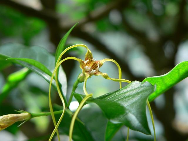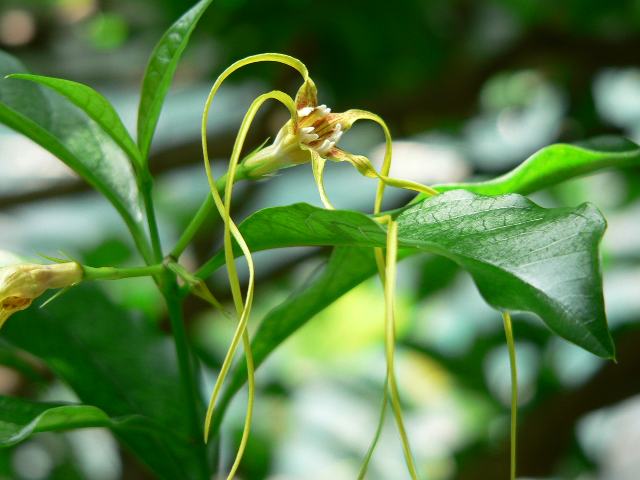 金竜花(キンリュウカ) 夏の花 2016年05月09日 金竜花(キンリュウカ)はキョウチクトウ科キンリュウカ属(ストロファンツス属)の蔓性常緑低木である。ストロファンツス属はアフリカや熱帯アジアに35種から40種くらいが分布する。本種が代表種で、属名の和名もキンリュウカ属という。和名の由来は、黄色い花弁(裂けた花冠)が細くねじれている様子をたとえたものである。別名を山羊の角夾竹桃(ヤギノツノキョウチクトウ)という。これは、二股に分かれて角のように見える実の形からつけられた名である。学名のストロファンツス・ディバリカツスで表示するものもある。本種の原産地は中国の南西部、ベトナム、ラオスで、山道の傍らなどに生える。樹高は2メートルから5メートルくらいである。葉は細長い卵形で、向かい合って生える(対生)。開花時期は5月から7月くらいである。花冠は黄緑色で5つに裂け、5本の萼片がだらりと紐状に垂れ下がる。喉の部分には赤紫色の模様が入る。花の後にできる実は袋果(熟すと果皮が自然に裂けて種子を放出する)である。実の中には白い長い毛が密生した細長い種子がたくさん入っている。全草が有毒だが、薬用としても強い効果がある。生薬名は羊角拗(ようかくおう)といい、ストロファンチンという強心作用をもつ物質が含まれている。属名の Strophanthus はギリシャ語の「strophos(ねじれた紐)+ anthos(花)」からきている。種小名の divaricatus は「広く開いて分かれた」という意味である。写真は5月に東京都薬用植物園の温室で撮った。学名:Strophanthus divaricatus★唸るほど不思議な花の姿見て 実も見たいなと思い強まり花図鑑植物図鑑ミラーサイト|味の麺匠戸田久|おこめの鬼平|フロム蔵王|花の本屋さん|楽天トラベル|