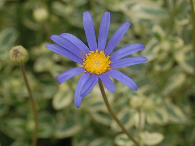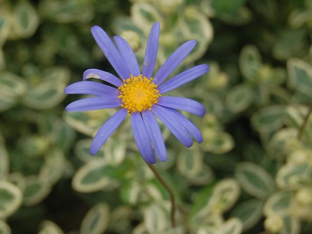 ブルーデージー 春の花 2013年03月18日 ブルーデージーはキク科ルリヒナギク属(フェリキア属)の多年草である。原産地は南アフリカのケープ地方である。和名は瑠璃雛菊(ルリヒナギク)という。草丈は20~60センチくらいである。茎と葉には粗い毛が生えている。葉は披針形(笹の葉のような形)で、向かい合って生える(対生)。葉には厚みがあり艶がある。開花時期は4~6月と9~10月である。花径は4~5センチである。舌状花は青く、筒状花は黄色である。花の後にできる実はそう果(熟しても裂開せず、種子は1つで全体が種子のように見えるもの)である。属名の Felicia はドイツのレーゲンズブルグの役人「フェリックス(Herr Felix, 1846没)さん」の名からきている。種小名の amelloides はキク科シオン属の「アメルス種(Aster amellus)に似た」という意味である。写真は3月に京都府立植物園で撮った。学名:Felicia amelloides★爽やかな青が和みを呼び寄せる ブルーデージーみなに愛され花図鑑植物図鑑|味の麺匠戸田久|おこめの鬼平|フロム蔵王|花の本屋さん|楽天トラベル|
