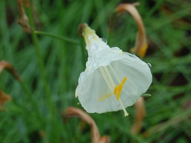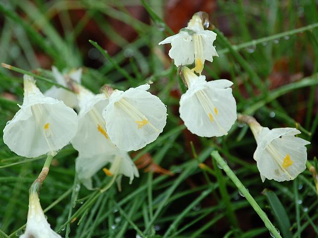 ナルキッスス・カンタブリクス 春の花 2013年03月21日 ナルキッスス・カンタブリクスはヒガンバナ科スイセン属の多年草である。分類体系によってはユリ科とされる場合もある。原産地はスペインや北アフリカのアルジェリア、モロッコなどである。草丈は10~20センチくらいである。根際から生える葉は細い円柱形である。開花時期は12~3月である。花茎の先に1つずつユニークな形をした白い花を横向きにつける。特徴は漏斗状の副花冠が発達していることである。花びら(花被片)は細い披針形であまり目立たず、ラッパのような副花冠が目に飛び込む。花の後にできる実はさく果(熟すると下部が裂け、種子が散布される果実)である。変種や園芸品種が多い。属名の Narcissus はギリシャ神話の青年の名からきている。泉に映った自分の姿に恋して死に、その後にこの花が咲き出した。種小名の cantabricus はスペインの「カンタブリア州(Cantabria)の」という意味である。写真は3月に京都府立植物園で撮った。学名:Narcissus cantabricus★ユニークな花の形が面白く しげしげと見るこれも水仙花図鑑植物図鑑|味の麺匠戸田久|おこめの鬼平|フロム蔵王|花の本屋さん|楽天トラベル|