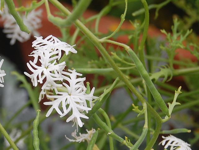 スキゾペタロン・ワルケリ 春の花 2013年03月22日 スキゾペタロン・ワルケリはアブラナ科スキゾペタロン属の一年草である。属名の読み方は「シゾペタロン」、種小名の読み方は「ウォーカリ」とするものもある。属名をイヌガラシ属とする記述をネットでは多く見かけたが、スキゾペタロン属(Schizopetalon)がイヌガラシ属(Rorippa)とシノニムという記述は発見できなかったので別属と判断し、そのままスキゾペタロン属とした。原産地はチリである。海辺に近い砂地に生える。草丈は30センチくらいである。葉は羽状に深く切れ込み、互い違いに生える(互生)。開花時期は3~6月くらいである。花の色は白く、花弁は4枚だが深く切れ込む。花弁の外側は黄緑色である。晴れた日には花弁を巻くようにして閉じてしまうが、曇りや雨の日には花弁を開く。花の後にできる実は角果(雌しべの中にある仕切りを残して左右の殻がはがれるもの)である。属名の Schizopetalon はギリシャ語の「schizo(裂ける)+petalon(花弁)」からきている。種小名の walkeri はスコットランドの博物学者「ウォーカー(John Walker, 1731-1803)さんの」という意味である。写真は3月に京都府立植物園で撮った。学名:Schizopetalon walkeri★切れ込めば花の姿も一変し 仲間は何と首をかしげる花図鑑植物図鑑|味の麺匠戸田久|おこめの鬼平|フロム蔵王|花の本屋さん|楽天トラベル|PR