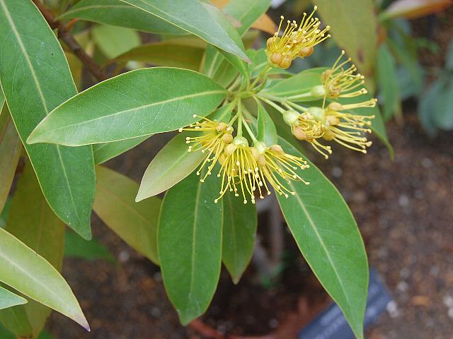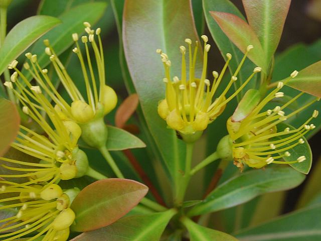 キサントステモン・クリサンツス 四季咲きの花 2013年02月21日 キサントステモン・クリサンツスはフトモモ科キサントステモン属の常緑高木である。属名の読み方は「クサントステモン」とするものもある。オーストラリアの東部に分布し、雨林に生える。樹高は10~15メートルくらいである。庭植えだとコンパクトで、3メートルくらいである。葉は披針形(笹の葉のような形)で、互い違いに生える(互生)。葉の質は革質で艶がある。葉の先は尖り、縁にぎざぎざ(鋸歯)はない。開花時期は周年である。枝先や葉の脇から総状花序(柄のある花が花茎に均等につく)を出し、花径1~2センチの黄色い花を15~30輪くらい半球状につける。花弁は5枚で黄色い。花弁よりも飛び出した黄色い雄しべが目立つ。花の後にできる実は球形のさく果(熟すると下部が裂け、種子が散布される果実)で、緑色ないし茶色である。属名の Xanthostemon はギリシャ語の「xantho(黄色い)+stemon (雄しべ)」からきている。種小名の chrysanthus は「黄色の花の」という意味である。写真は3月に大阪市の咲くやこの花館で撮った。学名:Xanthostemon chrysanthus★飛び出した黄色の雄しべがよく目立つ 花の姿に異国を感じ花図鑑植物図鑑|味の麺匠戸田久|おこめの鬼平|フロム蔵王|花の本屋さん|楽天トラベル|