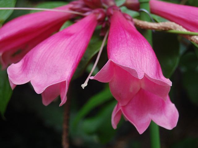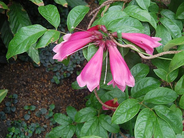 テコマンテ・ベヌスタ 春の花 2013年02月23日 テコマンテ・ベヌスタはノウゼンカズラ科テコマンテ属の蔓性常緑低木である。原産地はモルッカ諸島、ソロモン諸島、ニューギニア島、オーストラリアである。標高500~1500メートルの熱帯雨林に生える。テコマンテ・デンドロフィラ(Tecomanthe dendrophila)とシノニムだとする説と別種とする説がある。蔓の長さは3~6メートルくらいである。葉は奇数羽状複葉(鳥の羽のように左右に小葉がいくつか並び、先に1つの小葉がついて1枚の葉が構成される)で、向かい合って生える(対生)。小葉の形は卵形である。葉の質は革質で、縁にぎざぎざ(鋸歯)はない。開花時期は春から夏である。葉の脇に総状花序(柄のある花が花茎に均等につく)を出し、濃い紅紫色をしたラッパ状の花を房状に下向きにつける。花は長さが10センチくらいあり大きい。花冠の先は浅く5つに裂ける。本種は花冠の内側も同じ色になる。花の後にできる実はさく果(熟すると下部が裂け、種子が散布される果実)である。属名の Tecomanthe はギリシャ語の「Tecoma(テコマ属=近縁種)+anthos(花)」からきている。種小名の venusta は「愛らしい」という意味である。写真は3月に大阪市の咲くやこの花館で撮った。学名:Tecomanthe venusta★同じかなそれともどこか違うかな 仲間の様子に興味津々花図鑑植物図鑑|味の麺匠戸田久|おこめの鬼平|フロム蔵王|花の本屋さん|楽天トラベル|