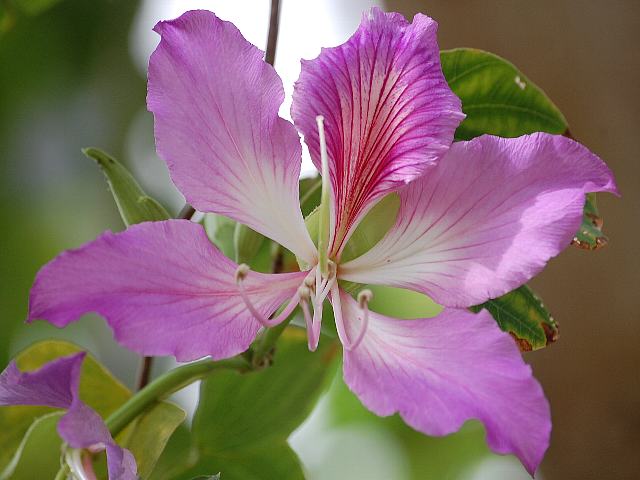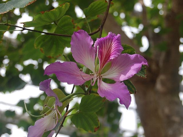蘇芯花(ソシンカ) 春の花 2013年02月24日 蘇芯花(ソシンカ)はマメ科ハカマカズラ属の落葉高木である。原産地は中国の南部、ミャンマー、インドなどである。中国名を「羊蹄甲」といい、そこから羊蹄木(ヨウテイボク)の別名もある。葉が羊の蹄に似ているというのが名の由来である。別名を斑入り蘇芯花(フイリソシンカ)という。日本では沖縄で街路樹や公園木とされている。樹高は8~12メートルくらいである。樹皮は暗い褐色で、ほぼ滑らかである。葉は円形で、真ん中あたりまでV字形に裂けている。葉の縁にぎざぎざ(鋸歯)はない。開花時期は3~4月である。花径が8~12センチくらいある大きな淡い紅紫色の花をつける。花冠は5つに裂け、真ん中の裂片には濃い紅紫色の斑が入る。花の色が白いものもあり、白花蘇芯花(シロバナソシンカ)という。英名はオーキッドツリー(orchid tree)である。花がランに似るところからつけられた名前である。若葉、蕾、花は食用とされる。樹皮からはタンニンや染料を採る。花の後にできる実は豆果(莢の中に種子が入るもの)である。属名の Bauhinia はスイスの植物学者「ボーアン兄弟(Jean Bauhin & Caspar Bauhin, 1500's-1600's)」にちなむ。葉の先が二つに割れているのを兄弟に見立てたものである。種小名の variegata は「斑入りの」という意味である。写真は3月に大阪市の咲くやこの花館で撮った。学名:Bauhinia variegata★艶やかに咲いて蘇芯花雲南に 春を伝える景色やいかに花図鑑植物図鑑|味の麺匠戸田久|おこめの鬼平|フロム蔵王|花の本屋さん|楽天トラベル|