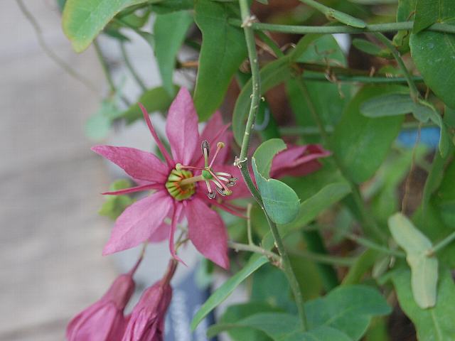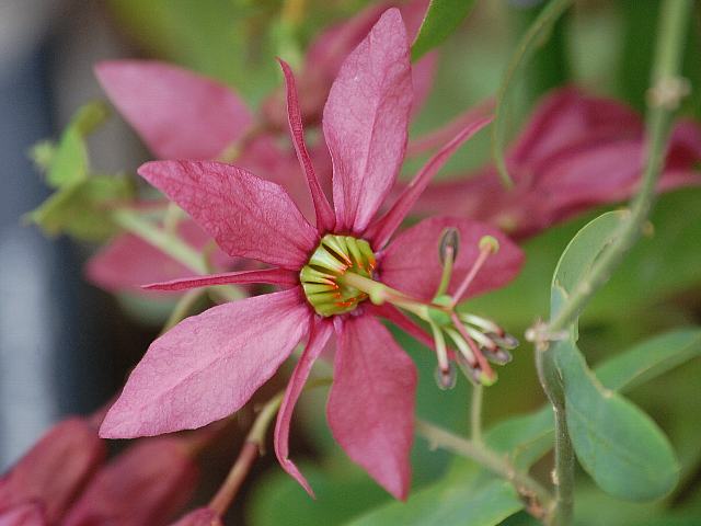 パッシフローラ・ペルフォリアタ 四季咲きの花 2013年02月25日 パッシフローラ・ペルフォリアタはトケイソウ科トケイソウ属の蔓性常緑多年草である。原産地はジャマイカである。草丈は2~4メートルになる。葉が貫生葉(対生する葉のつけ根の部分が発達して互いにくっつき、茎が葉を突き抜けたように見えるもの)なのが特徴である。開花時期は5~10月くらいである。温室では周年開花をする。花径は4~6センチくらいあり、花の色は濃い紅紫色である。萼片と花弁がそれぞれ5枚ずつある。近縁種には萼片と花弁が同じ色と形のものがあるが、本種は明らかに大きさが異なる。副花冠が水平に放射状に開き、時計の文字盤のように見える。花の後にできる実は液果(果皮が肉質で液汁が多い実)である。属名の Passiflora はラテン語の「flor della passione(情熱の花)」からきている。雌しべの柱頭をはりつけにされたキリストにたとえ、放射状の副花冠をキリストの後光にたとえた。種小名の perfoliata は「茎が葉を貫いたような」という意味である。写真は3月に大阪市の咲くやこの花館で撮った。学名:Passiflora perfoliata★いろいろな仲間があるね時計草 ペルフォリアタは葉っぱに個性花図鑑植物図鑑|味の麺匠戸田久|おこめの鬼平|フロム蔵王|花の本屋さん|楽天トラベル|PR